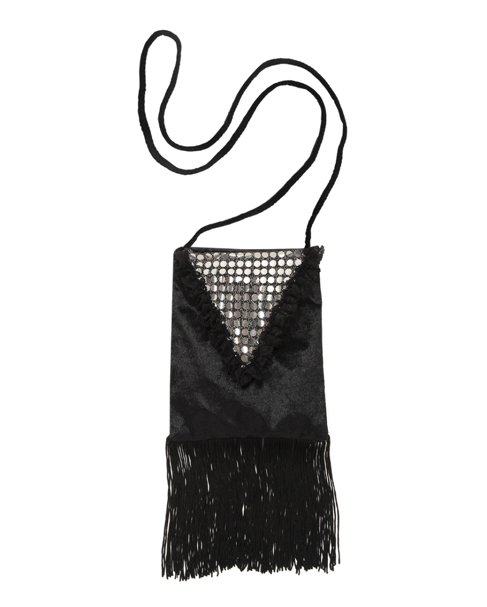 20er Jahre Charleston-Handtasche mit Fransen Retro Handtasche im klassischen 20ies Style als Kostümzubehör Die goldenen zwanziger Jahre sind als Mottopartie gefragt wie nie zuvor. Glitzernde Stirnbänder, lange Feder-Boas und ein fransiger Bund am knielangen Kleidchen lassen dich im Flapper Kostüm zauberhaft aussehen. Gönne dir zur Bubikopffrisur, Zigarettenspitze und 20er Jahre Kostüm doch noch die 20er Jahre Charleston-Handtasche mit Fransen als Kostüm Accessoire. Setze Akzente zu deinem Flapper-Outfit! Die 20er Jahre Handtasche mit Fransen lässt sich locker über eine Schulter hängen und wird dort von einer schwarzen Schnur gehalten. Beide Seiten der Handtaschenoberfläche sind mit silbernen Fake Pailletten verziert, die ein Dreieck formen und mit schwarzer Spitze eingerahmt wurden. Die 20er Jahre Handtasche lässt sich durch einen dezenten Reißverschluss schließen, der sich auf der oberen Seite befindet. Lieferumfang: 1 x Retro Handtasche im klassischen 20ies Style als Kostümzubehör Farbe: schwarz Größe: ca. 18 x 14,5 cm, Fransenlänge ca. 11 cm Material: 100% Polyester