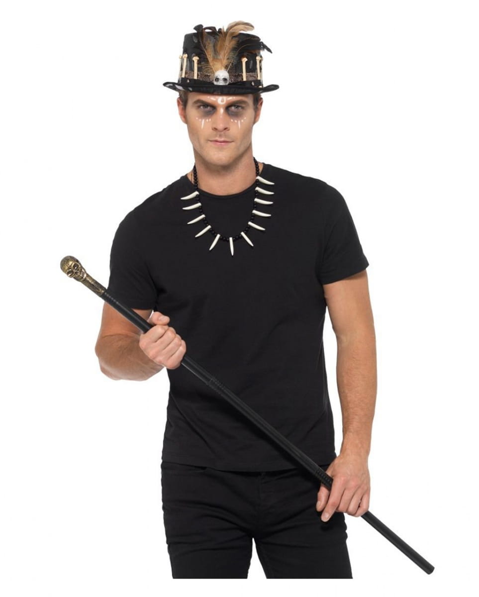 3-tlg. Voodoo Kostümzubehör Set für Halloween Verkleidungen Unisex Verkleidungs-Set mit Zylinder, Totenkopf-Spazierstock und Knochenkette Führe schaurige Rituale durch und verwende die schwarze Magie zur Erfüllung deiner sehnlichsten Wünsche mit unserem 3-tlg. Voodoo Kostümzubehör Set für Halloween Verkleidungen als Voodoo-Priester kostümiert auf den nächsten Walpurgisnacht-Feiern und unheimlichen Mottopartys! Das 3-tlg. Voodoo Kostümzubehör Set für Halloween Verkleidungen besteht aus Hut, Kette und Stock. Der Zylinderhut des Halloween-Kostümaccessoires ist mit mehreren Knochen sowie einem kleinen Totenschädel vorne und Federn geschmückt. Ein schwarzer Gehstock samt goldenem Totenkopf-Knauf sowie eine Knochenkette runden deine Erscheinung als Hexer stimmig ab. Das Voodoo-Kostümset eignet sich für Männer und Frauen. Lieferumfang: 1 x 3-tlg. Voodoo Kostümzubehör Set für Halloween Verkleidungen Inhalt: 1x Zylinderhut mit Federn, 1x Stock mit Totenkopf, 1x Knochenkette Farbe: Schwarz/Gold/Beige/Braun Größe: One Size für Erwachsene Material: Kunststoff, Polyester