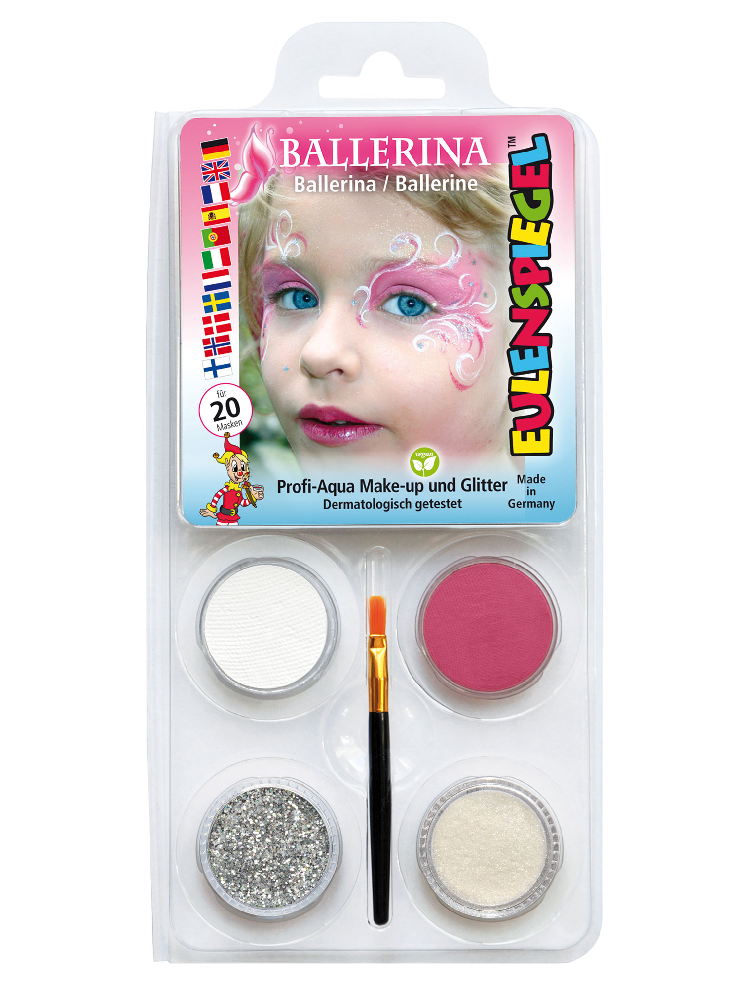 Jedes Mädchen träumt davon, einmal eine echte Ballerina zu sein und die Zuschauer zu verzaubern. Mit dem Aqua-Set Ballerina wird es wahr, hiermit kannst Du Deinem Tanzoutfit den letzten Schliff verleihen. Die Farben Weiß und Rosa passen zu jedem Ballerinakostüm und der Glitzer lässt Dein Gesicht im Scheinwerferlicht strahlen. Du kannst Dich entweder natürlich schminken, von der Vorlage auf der Packung inspirieren lassen oder Dein eigenes ausgefallenes Make-Up für den großen Auftritt kreieren. Mit dem Aqua-Set Ballerina wirst Du oder Dein Kind zu einer tollen Balletttänzerin. Das Motiv-Set reicht für circa 20 Masken.