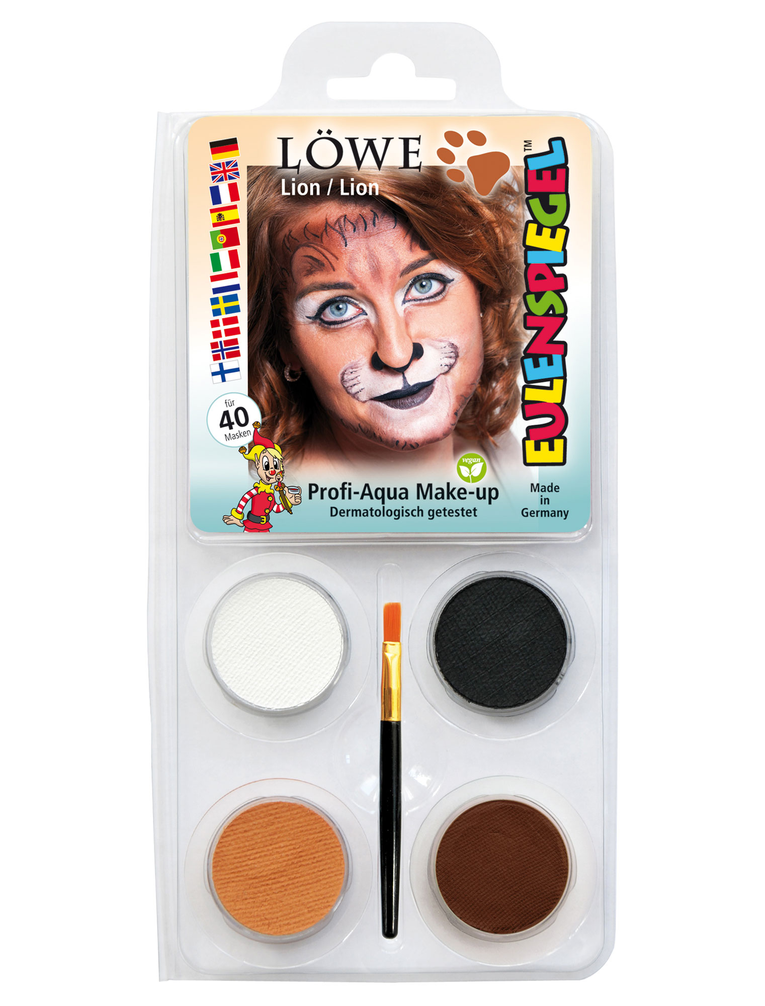 Mit einer Verkleidung als König der Tiere sind Dir Aufmerksamkeit und Respekt auf der nächsten Kostüm-Party garantiert. Damit Dir der Auftritt als majestätischer und furchterregender Löwe gelingt, benötigst Du neben einem passenden Kostüm das richtige Make-Up. Das Aqua-Set Löwe verfügt über alle Farben, die Du für eine Verkleidung als Raubtier benötigst. Mit ein bisschen Geschick oder der Hilfe von einem guten Freund wirst Du zu einem gefährlichen Wüstenkönig. Die Farben des Aqua-Sets Löwe sind hautfreundlich und können nach einem langen Tag leicht abgewaschen werden. Das Motiv-Set reicht für circa 40 Masken.