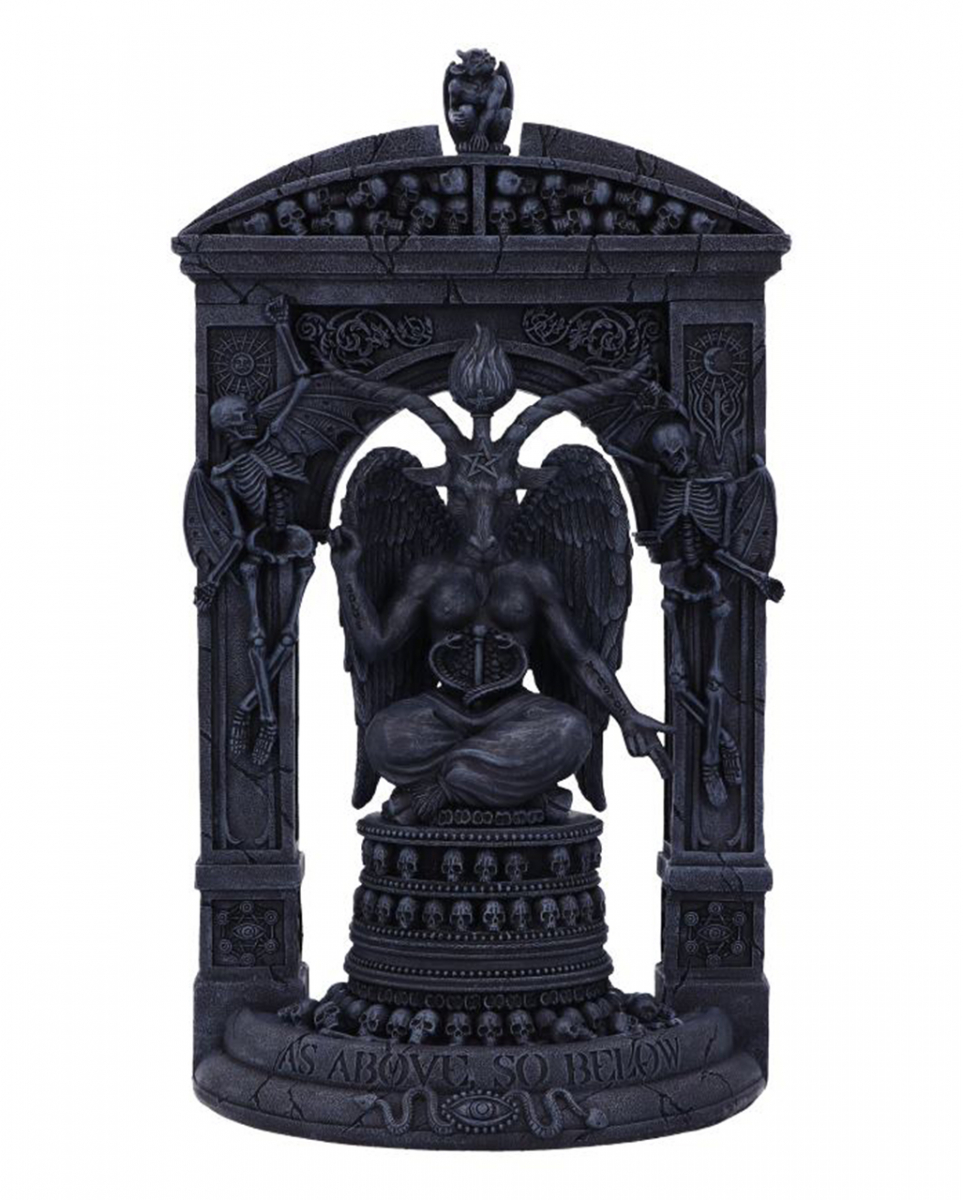 Baphomet’s Tempel Gothic Aufsteller 28cm Dekofigur für Tempelritter Fans und Okkultisten Baphomet´s Tempel Gothic Aufsteller ist eine hochwertige Kunststein Statue, die die gehörnte Sabbat-Ziege auf einem Thron zeigt. Sie ist von mystischen Säulen und Gerippen umgeben. Baphomet´s Tempel Gothic Aufsteller ist eine ca. 28 cm hohe Baphomet Dekofigur für Gothics. Sie ist aus Polyresin gegossen, von Hand bemalt und eine Okkult Deko für deinen Hausaltar. Lieferumfang: 1 x Baphomet’s Tempel Gothic Aufsteller 28cm Farbe: Schwarz Größe: ca. 28 cm Gewicht: ca. 1,6 kg Material: Polyresin (Kunststein) Baphomet Polyresin Statue als Okkult Deko Hochwertige Geschenkidee für Gothic- und Pagan Fans Von Hand bemalt Der Artikel ist ein Dekoartikel. Nicht für Kinder unter 3 Jahren geeignet. Kann Kleinteile enthalten, die verschluckt werden können – Erstickungsgefahr. Von Feuer und offenen Flammen fernhalten.