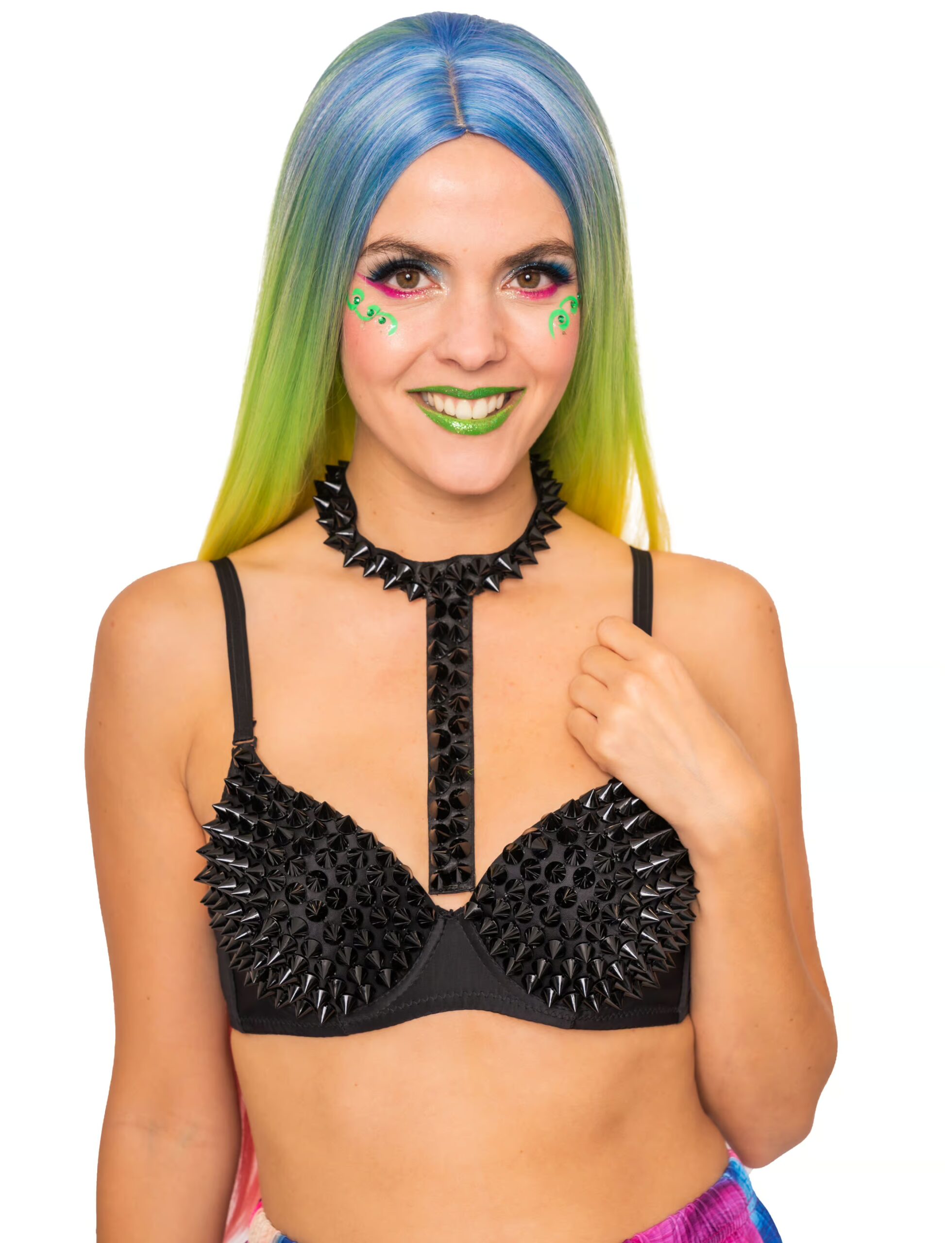 Sehr imposant ist dieses dreiteilige, schwarze BH-Set aus Polyester, das als interessantes und sexy Accessoire für Faschings-, Halloween- oder auch Punker Kostüme nicht nur die Blicke der Herren auf sich zieht. Das Punker Set, spricht für sich. Es besteht aus einem schwarzen BH mit verstellbaren Trägern und nietenbesetzten Körbchen, einer langen Nietenkette und zwei Nietenarmbändern. Der BH ist das perfekte darunter für eine fetzige Rockerbraut. Kette und Armbänder runden das Gesamtbild effektvoll ab.