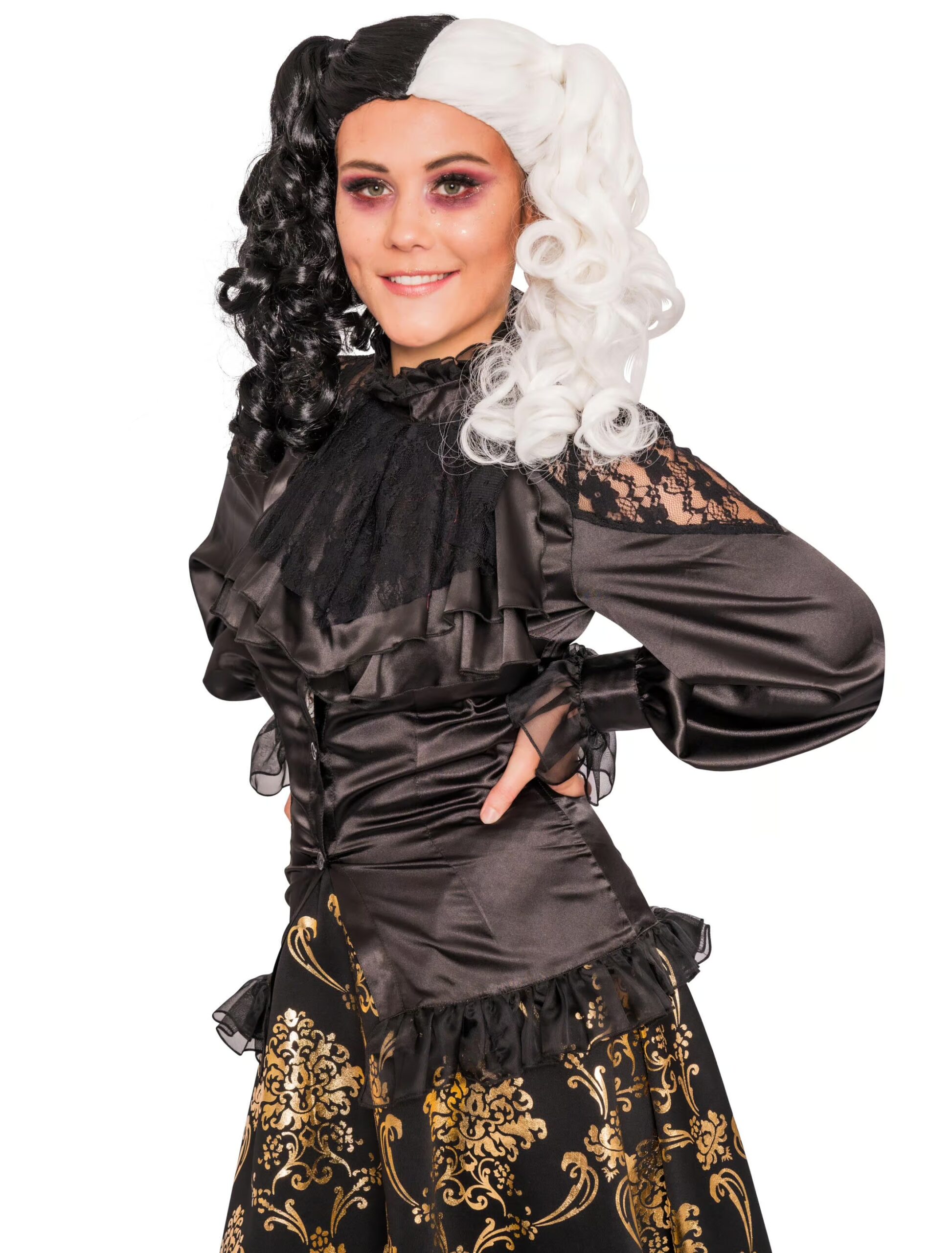 Du bist auf der Suche nach einer viktorianisch angehauchten Bluse für Deinen Steampunk-Look? Unsere schwarze Bluse mit angenähtem 3-lagigen Jabot, Spitzeneinsatz an den Schultern sowie extra breiten, rüschenverzierten Ärmelenden aus Polyester lässt sich mit einer Knopfleiste schnell öffnen und schließen. Kombiniere diese aufwendig gearbeitete Bluse mit unserem mit Goldornamenten bedruckten Steampunk Rock und den passenden Accessoires aus unserem Shop und fertig ist Dein unvergessliches Kostüm für die nächste Mottoparty.
