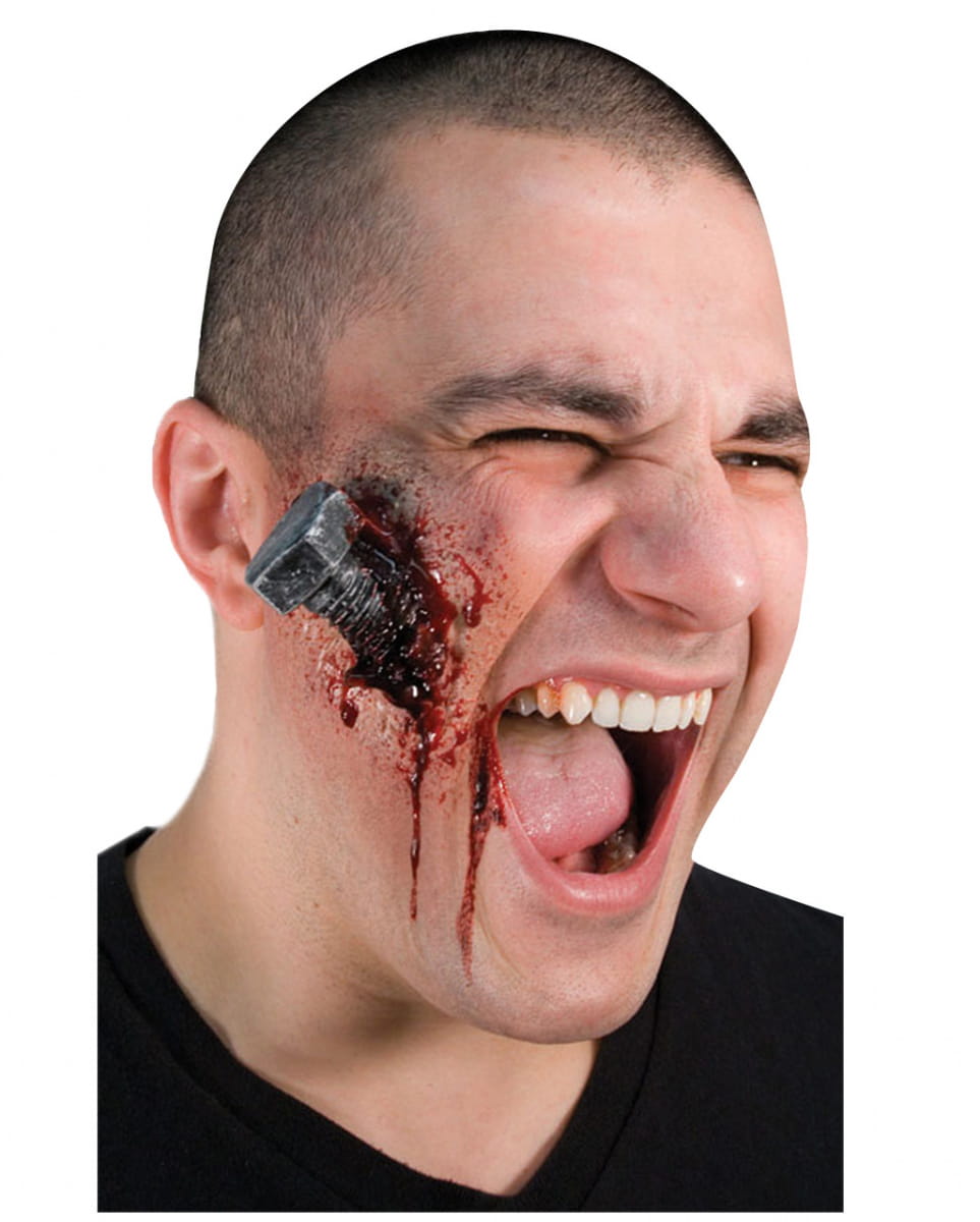 Blutige Schrauben Wunde Krasse Halloween Wunde aus Latex für ein blutiges Horror Make-up Große, blutig Maschinenschraube die nach einem tragischem Unfall an der Werkbank aus dem Körper ragt! Die super realistisch aussehende Schraube wird mit Mastix (Hautkleber) ganz einfach an die Stelle geklebt an der das arme Opfer sich verletzt haben soll. Die vorgeschminkte Schraube sieht nach dem Perfektionieren mit Make Up und Filmblut so gut aus, dass selbst die Feuerwehr und das Rote Kreuz diese Wunde zur realistischen Unfalldarstellung benutzen. Am leichtesten geht das Schminken  mit unserem spezial SFX Kit Unfall Wunden Schminkset . Mit dieser ekligen Schraube im Kopf bist Du der Hit auf jeder Halloween oder Faschingsparty. Ouch! Mastix Hautkleber klein , Aquacolor hautfarben 30ml und Blut Gel / Blood Gel 30ml nicht inkl. Lieferumfang: 1x Blutige Schrauben Wunde Inhalt: 1x Latex Applikation Hautkleber und Blut nicht im Lieferumfang enthalten Material: Latex