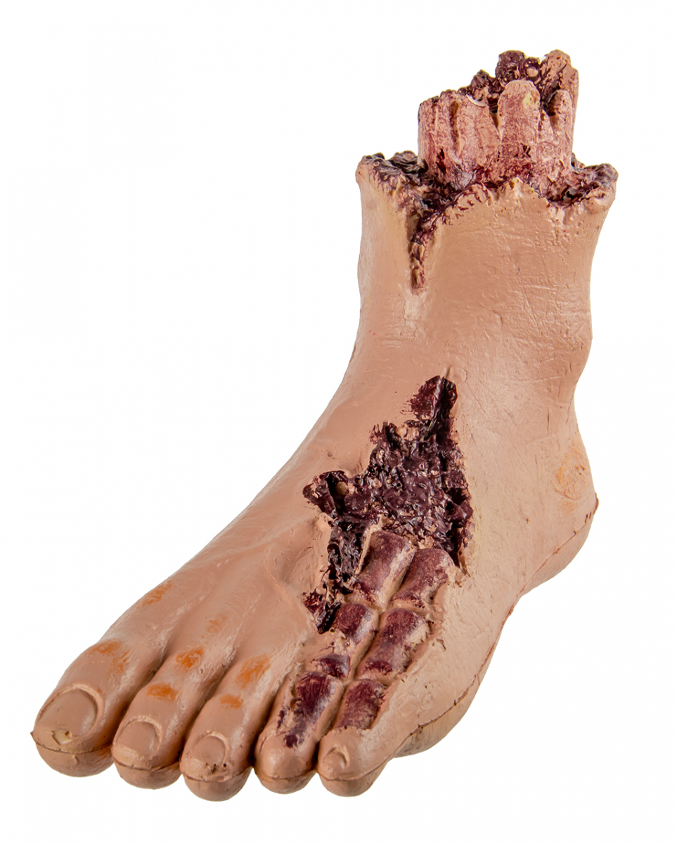Ausgerissener, blutiger Fuß eines Zombies Zombie Deko für Halloween und Zombie Walks Der Ausgerissene, blutige Fuß eines Zombies vollendet dein Zombie Kostüm und macht auch als Gruseldeko einiges her. Der Ausgerissene, blutige Fuß eines Zombies ist der linke Fuß eines Menschen, der oberhalb des Knöchels abgetrennt wurde. Der Knochenstumpf steht blutig heraus und Blut läuft daraus in die darunter befindliche Wunde auf dem Fuß. Das Fleisch ist dort bei den letzten beiden Zehen außen bis auf die Knochen weggefressen, die Knochen sind blutig verschmiert. Der hintere Teil der Wunde zeigt das rosa und blutige Fleisch. Neben der großflächigen Wunde sind die Sehnen unter der Haut zu erkennen. Lieferumfang: 1 x Ausgerissener, blutiger Fuß eines Zombies Farbe: rot/hautfarben Größe: ca. 25 cm lang Material: Vinyl Kostümzubehör für den Zombie Walk. Achtung: Der Artikel ist ein Dekoartikel für Erwachsene und ist kein Spielzeug. Nicht für Kinder und Jugendliche unter 3 Jahren geeignet. Kann Kleinteile enthalten die verschluckt werden können – Erstickungsgefahr. Von Feuer und offenen Flammen fernhalten.