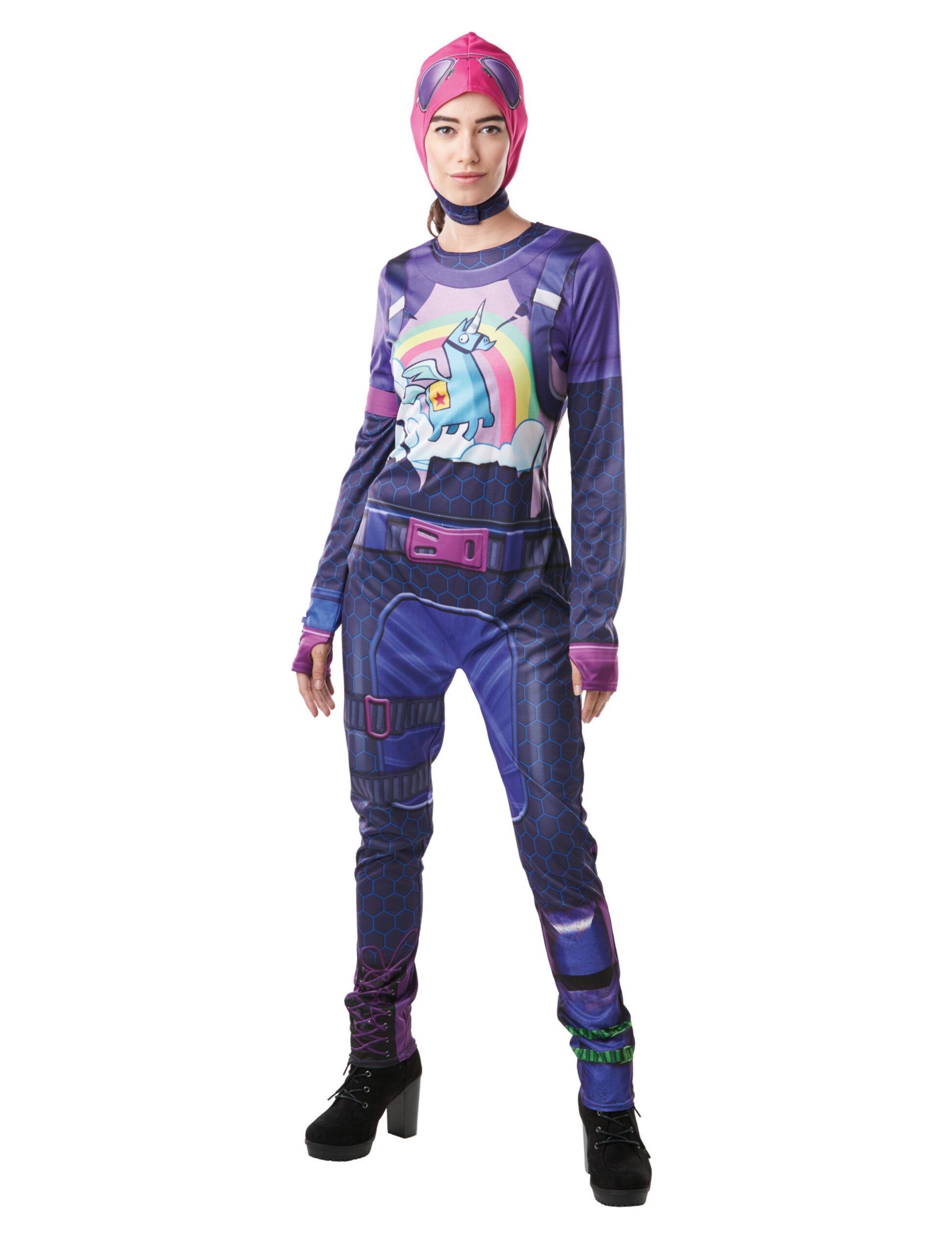Du bist ein großer Fan von Brite Bomber aus Fortnite? Dann schlüpfe einfach beim nächsten Karneval in die Rolle dieser starken Lady in Violett. Auch für Fortnite Mottopartys ist das 4-teilige Outfit geeignet, das sich aus einem Overall, einer Haube, einer Armbinde und einem Chug Jug als Zubehör zusammensetzt. In vielen unterschiedlichen Größen kannst Du den trendigen Look für Damen bestellen und Dir ein spaciges Kostüm ganz einfach selbst gestalten. Die Front des Overalls wird von einem süßen Einhorn geziert und in die Haube wurde die typische Brite Bomber Fliegerbrille integriert. Bei diesem Kostüm handelt es sich um offiziellen FORTNITE – EPIC GAMES Merchandise!