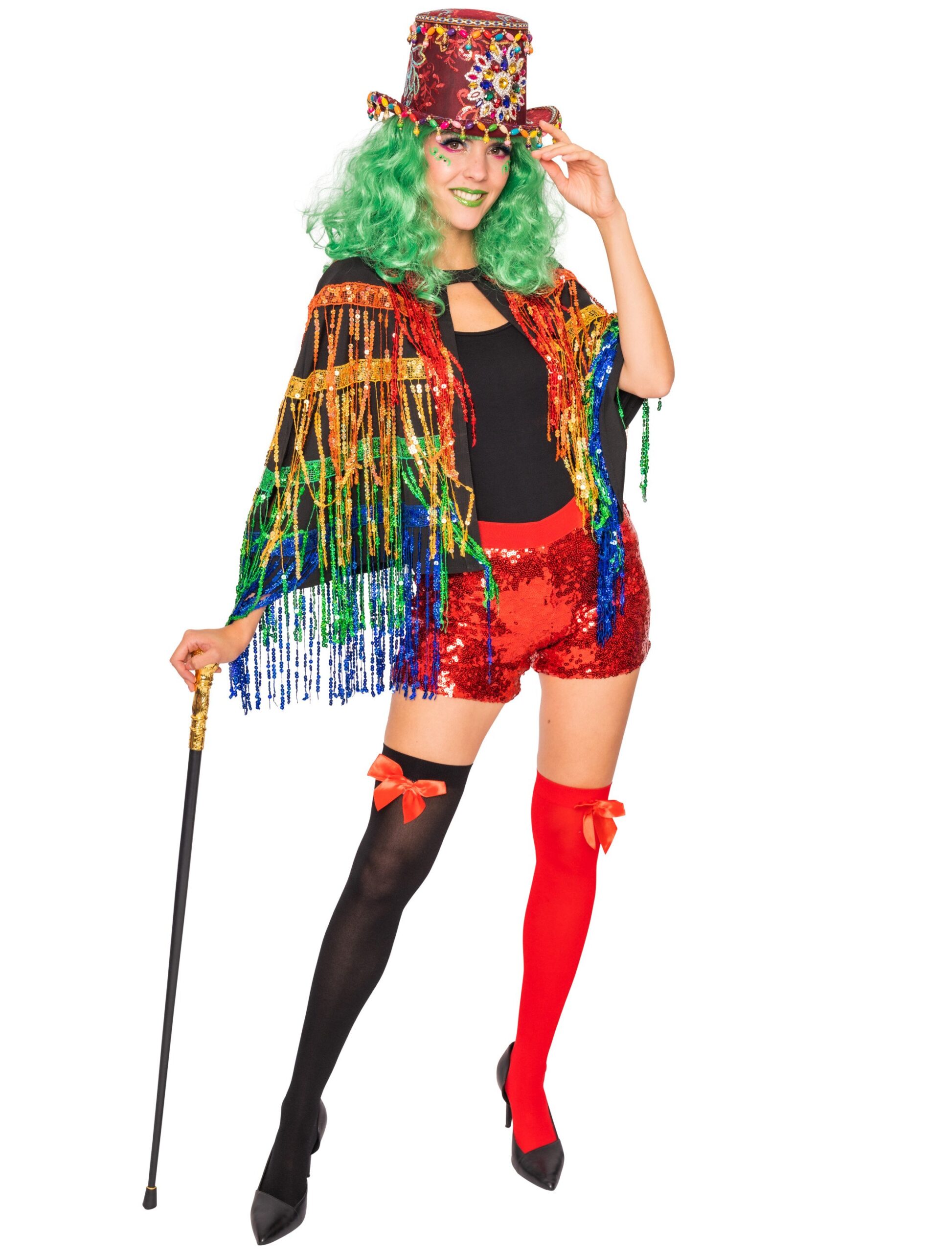 Lametta ist nur etwas für den Weihnachtsbaum? Unser ärmelloses Cape mit Klettverschluss am Hals und bunten Paillettenstreifen beweist das Gegenteil. Mit diesem bunt und reichlich verzierten Cape zeigst Du Lebensfreude und sorgst für gute Laune auf jeder Kostümparty. Das weich fließende Lametta-Cape aus Polyester fällt bequem über die Schultern und macht jede Bewegung mit. Mit süßen Kniestrümpfen und sexy Paillettenshorts siehst Du einfach unwiderstehlich aus. Ein extravaganter Zylinder und eine grüne Perücke runden Deinen extravaganten Look ab.
