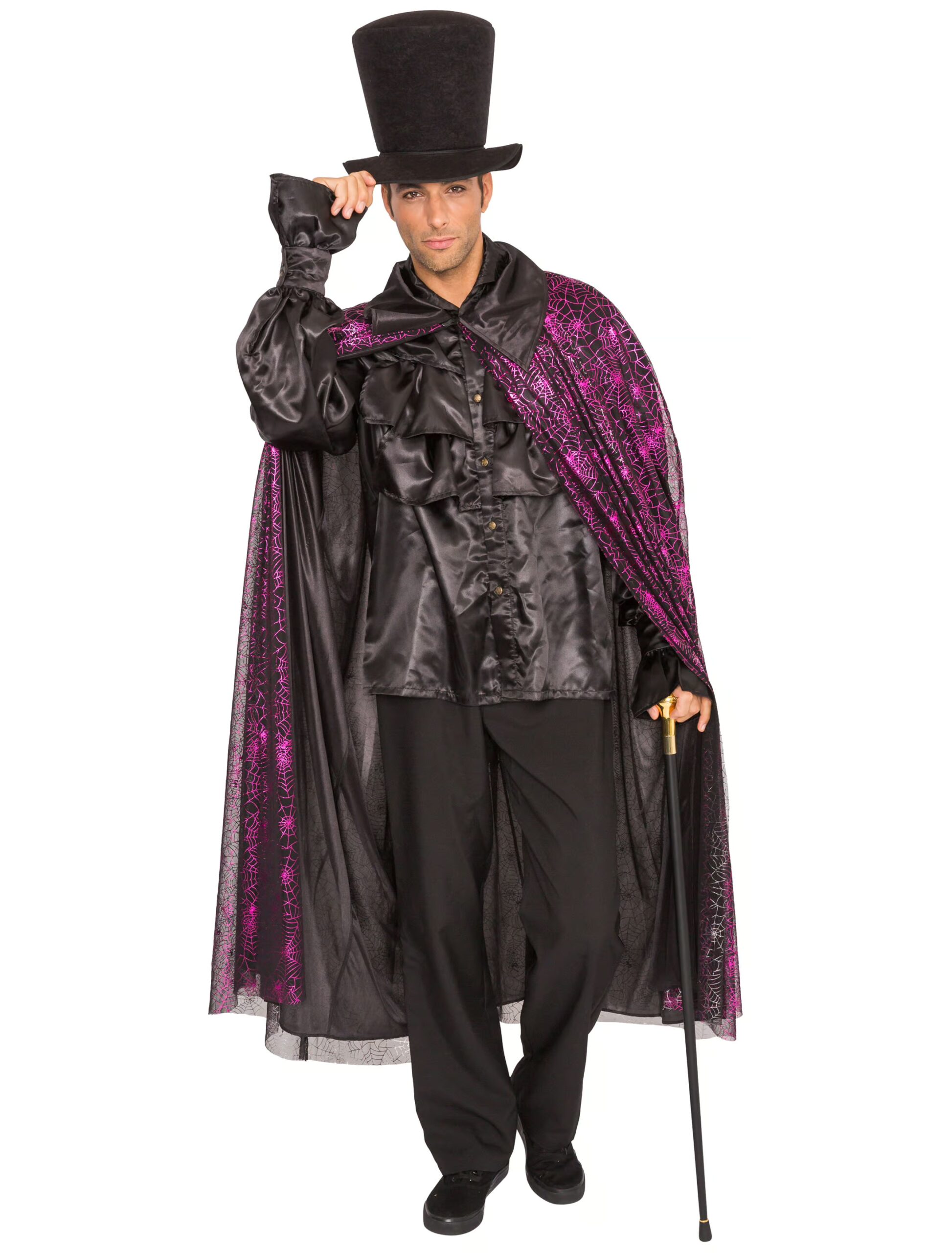 Du bist zu einer Halloweenparty eingeladen und suchst noch den letzten Schliff für Deine schaurige Verkleidung? Gar kein Problem! Unser Cape mit Spinnweben in Pink-Schwarz darf hier nicht fehlen. Das zweilagige Cape wird vorne am Hals mit einem Knopf befestigt. Ein schön gruseliges Kostümteil für die nächste Halloweenparty. Der Umhang ist aus 100% Polyester gefertigt. Das Produkt beinhaltet nur einen Umhang.