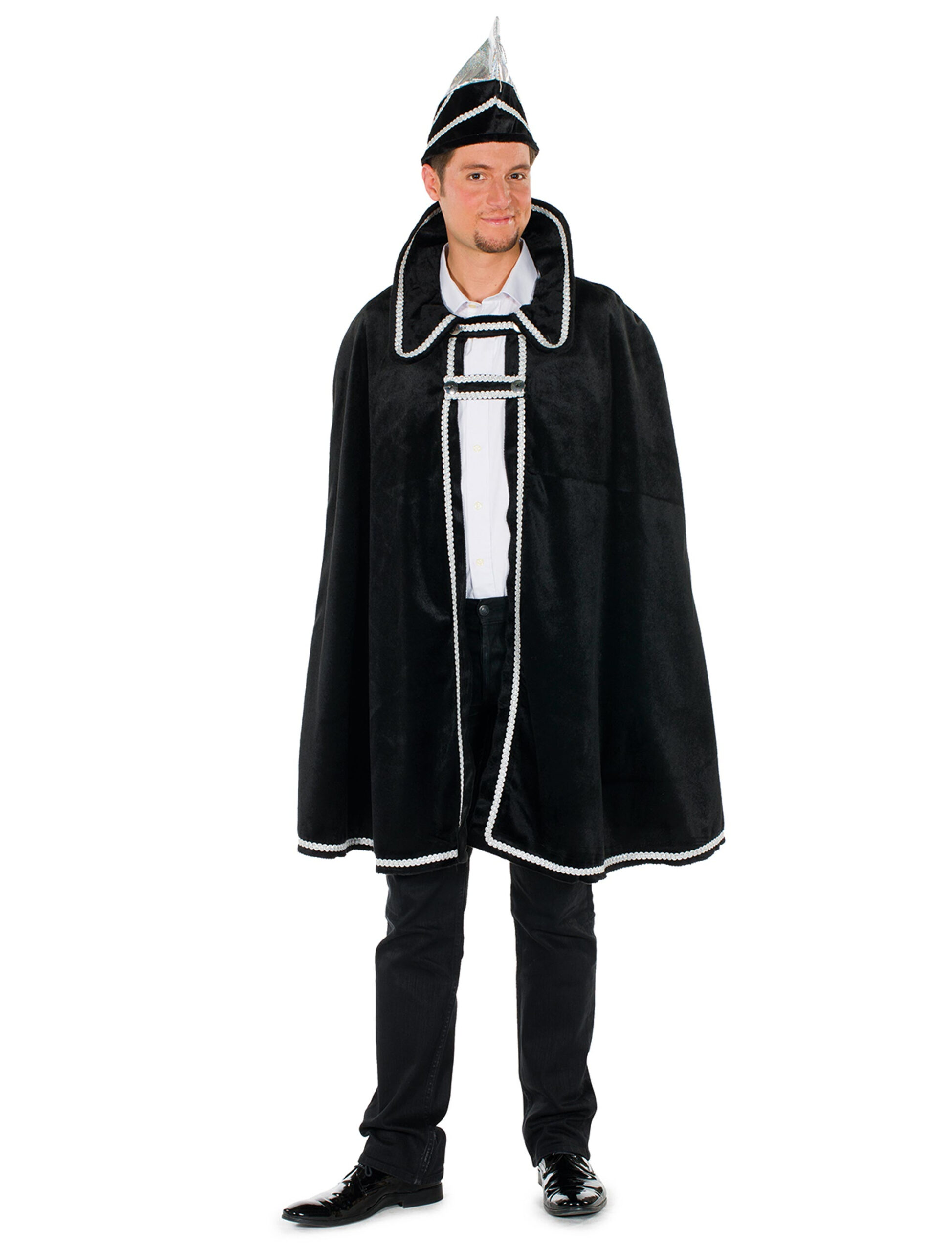 Egal ob Mottoparty oder Karneval, mit diesem Prinzen Cape ziehst Du überall die Blicke auf Dich. Dieses zweiteilige Set, bestehend aus Cape und Mütze, besticht durch seine hochwertige Verarbeitung sowie hohen Tragekomfort. Die edle Farbkombi von schwarz und silber passt perfekt zur Attitüde eines Prinzen und bietet Raum für weitere Kombinationsmöglichkeiten. Durch den großzügigen Schnitt, kannst Du auch langärmlige Oberteile unter dem Cape tragen, was zur kalten Jahreszeit von großem Vorteil ist.