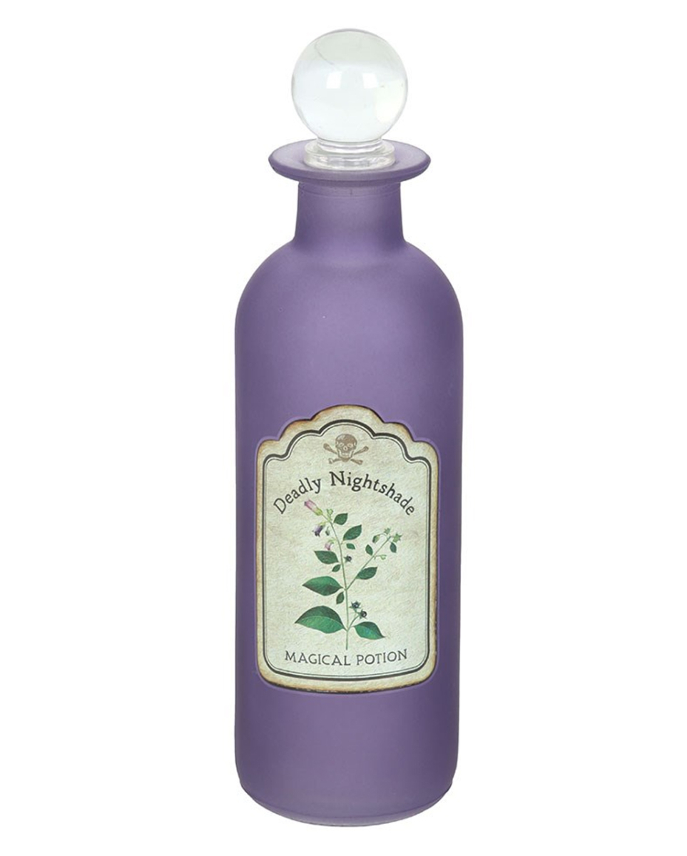 Dekorative „Deadly Nightshade“ Zaubertrankflasche aus Glas Hexen- und Wicca-Wohnaccessoire im Nostalgie-Look Die dekorative Deadly Nightshade Zaubertrankflasche aus Glas zieht alle Blicke auf sich. Diese lila Vintage-Flasche kommt mit einem nostalgischen Etikett und einer Glaskugel als Stopfen. Ein toller Hingucker in deiner Hexenküche. Die Deko-Giftflasche ist eine Attrappe (nicht lebensmittelecht, reine Dekoration). Sie besteht aus Glas, das lila getönt ist. Das Etikett zeigt ein tödliches Nachtschattengewächs. Lieferumfang: 1 x Dekorative „Deadly Nightshade“ Zaubertrankflasche aus Glas Farbe: Violett, Beige, Grün, Schwarz Größe: ca. 19,2 × 5,5 × 5,5 cm Material: Glas, Kunststoff Vintage-Dekoflasche als Wicca Wohnaccessoire Düstere Ästhetik Mit Apotheker-Etikett und Glaskugel Die Deadly Nightshade Gothic-Dekoflasche ist nicht lebensmittelecht