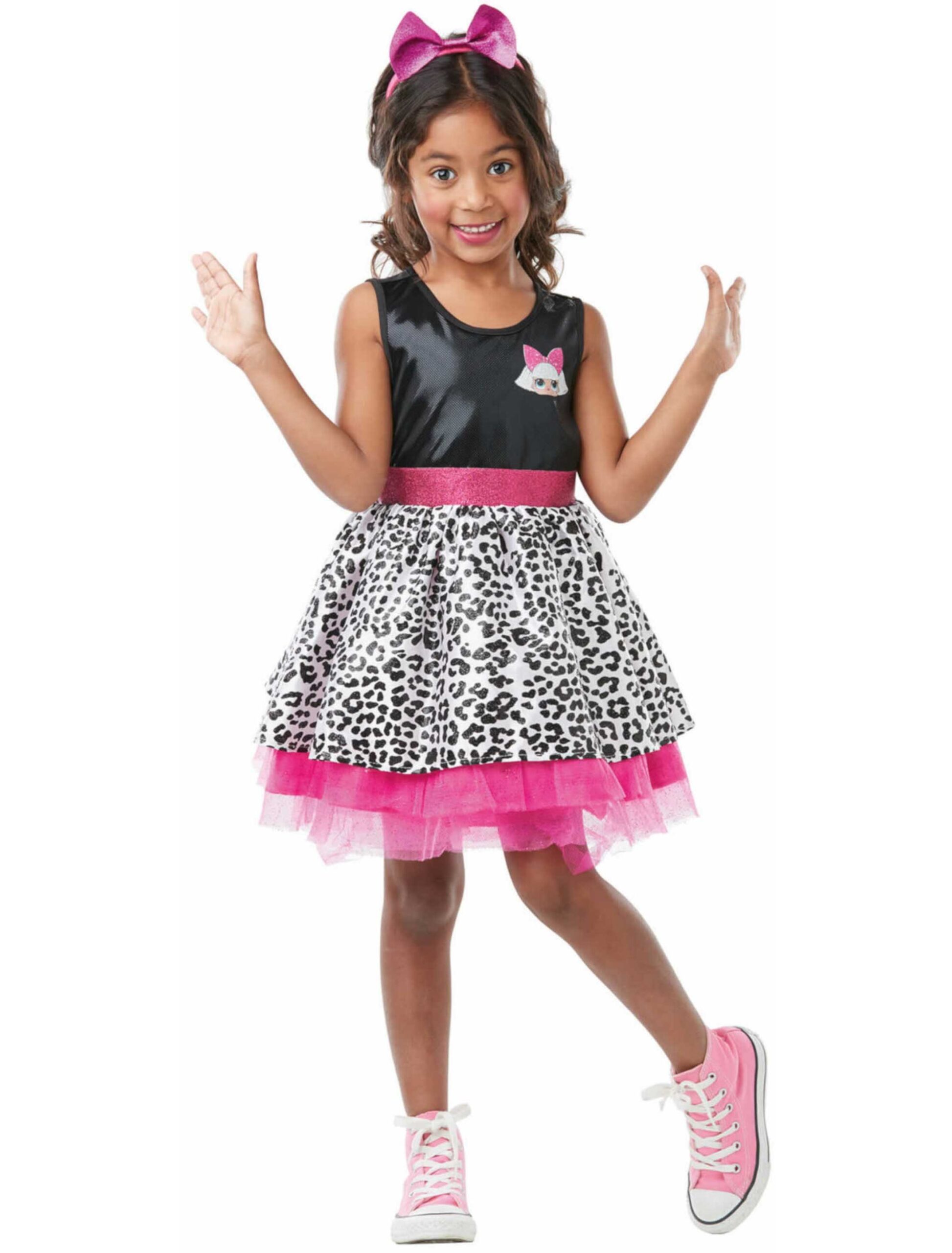 Voll angesagt sind bei den kleinen Mädchen die reizenden LOL-Sammelpuppen sowie die hübschen Outfits, Accessoires und die vielen niedlichen Kleinigkeiten. Und jeder LOL-Sammelpuppen-Fan wünscht sich einmal, wie sein Lieblingspüppchen auszusehen um in diesem trendigen Outfit seine Freundinnen zu überraschen. Mit dem zweiteiligen, bezaubernden L.O.L. Divakleid kannst Du Deinem kleinen Spatz diesen Herzenswunsch erfüllen. Das Kostüm besteht aus dem entzückenden Kleidchen mit glänzendem, schwarzen Oberteil samt Charakterprint, dem bauschigen, mehrlagigen Rock mit Leopardenmusterung und pinkfarbenem Tüllunterrock, dem hübschen pinken GlitzerGürtel sowie dem Haarreif mit der pinken Glitzerschleife. Ein Kostüm zum Verlieben und genau das richtige Geburtstagsgeschenk für Deine kleine Maus. Bei diesem Kostüm handelt es sich um ein offizielles Lizenzkostüm. L.O.L. Surprise Diva.