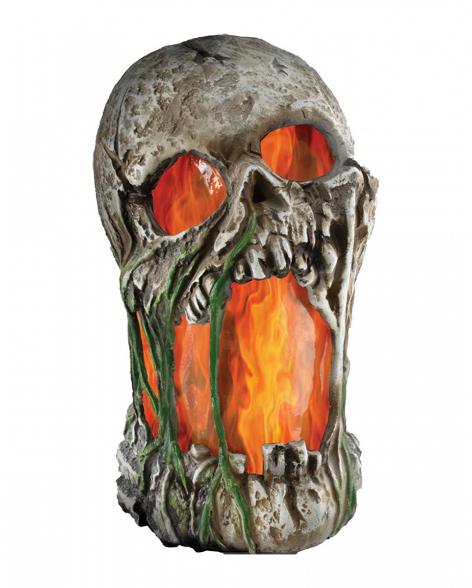 Modriger Totenschädel mit Flammeneffekt Brennender Halloween Totenkopf als Tischdeko Unser modriger Totenschädel mit Flammeneffekt erweckt den Eindruck als würde er von innen heraus brennen. Die Flammen sehen super realistisch was, was den Schädel zur 1A Horror Deko macht. Der aus Kunststoff gefertigte Deko Totenkopf kommt mit aufgerissenem Kiefer und einer modrig wirkender Oberfläche. Er funktioniert mittels Batterien, die du separat dazu kaufen kannst. Lieferumfang: 1 x Modriger Totenschädel mit Flammeneffekt Farbe: Grau, Grün, Orange Größe: ca. 33 x 17,8 x 20,3 cm Material: Kunststoff Batterien nicht enthalten Brennender Effekt Leuchtende Gruseldeko Der Artikel ist ein Kostümzubehör für Erwachsene und kein Spielzeug. Nicht für Kinder unter 3 Jahren geeignet. Kann Kleinteile enthalten, die verschluckt werden können – Erstickungsgefahr. Von Feuer und offenen Flammen fernhalten.