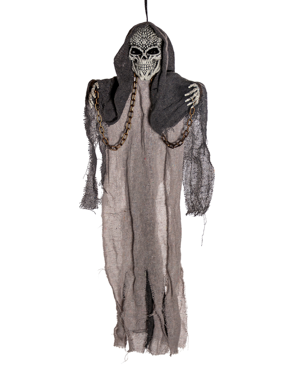 Gefesselter Geist mit Fetzenkostüm und Kapuze 53 cm Reaper Hängefigur mit schwarzem Fetzenkleid und Totenkopfgesicht Unser gefesselter Geist mit Fetzenkostüm und Kapuze versetzt deine Besucher in Angst und Schrecken! Seine beängstigende Fratze und die Schlosskette verleihen der Gruselgestalt Geisterhaus-Charme. Diese Halloween Hängefigur in Schwarz-Grau bietet einen beeindruckenden einen echten Blickfang auf deiner Horrorparty. Die Größe beträgt ca. 53 x 36 x 6 cm. Unsere Skelettfigur zum Aufhängen ist preiswert und wiederverwendbar. Lieferumfang: 1 x Gefesselter Geist mit Fetzenkostüm und Kapuze 53cm Farbe: Grau, Beige, Schwarz, Braun Größe: ca. 53 x 36 x 6 cm Material: Kunststoff, Polyester, Draht Geisterhafte Skelettfigur im Fetzengewand Arme sind biegbar, Kette zum flexiblen Positionieren Grim Reaper Gruselfigur Nur zum Hängen: ohne Funktion, keinen Sound, kein Licht, keine Bewegung