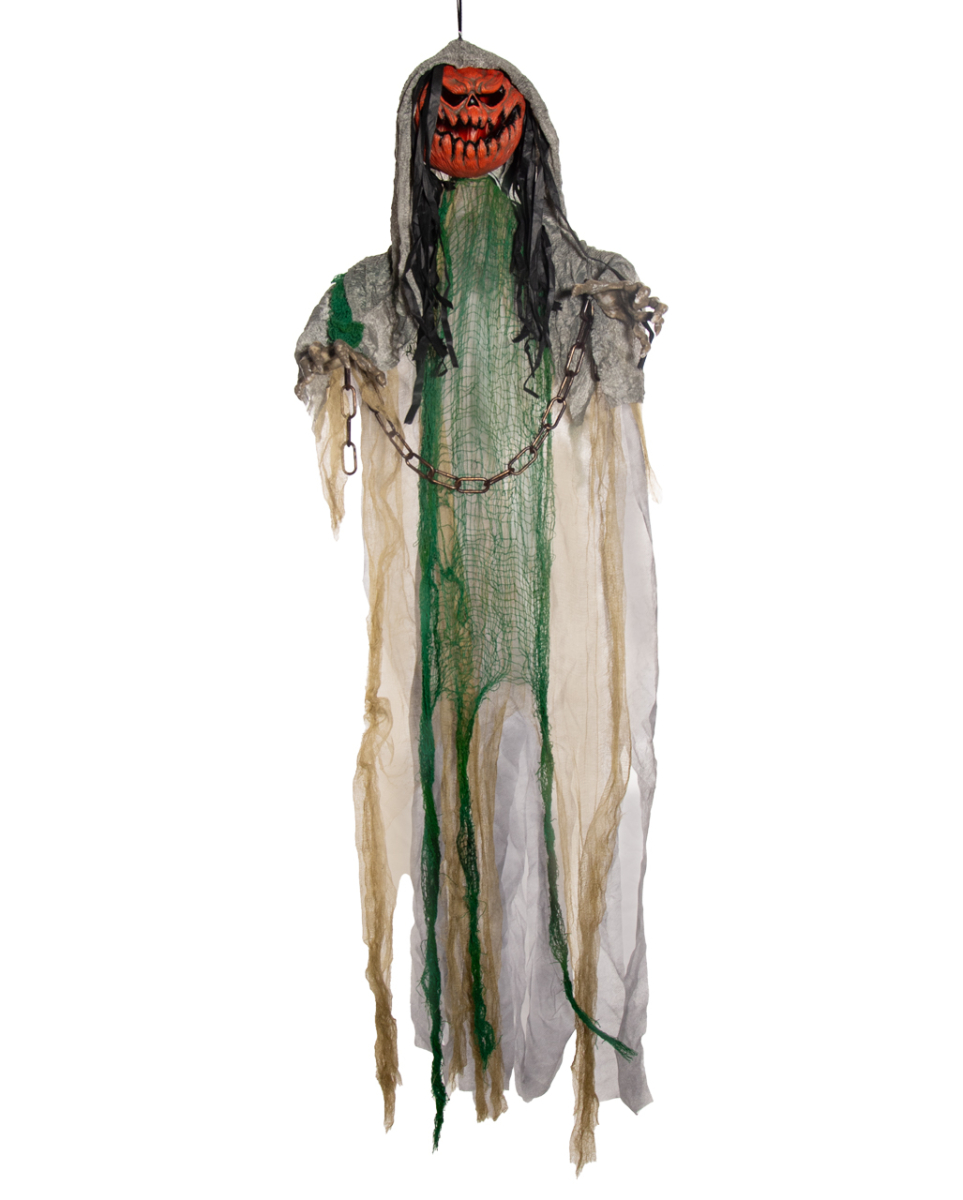Gefesselter Kürbisgeist Hängefigur mit Licht und Ton 120 cm Halloween Pumpkin-Geist mit Lichteffekt als Geisterbahn-Deko Mit dem unheimlichen Pumpkin-Kopf und den gefesselten Armen ist diese Halloween Hängefigur ein beängstigender Hingucker. warte nur ab, wenn sie zum Leben erwacht und Rache schwört! Unsere Gefesselter Kürbisgeist mit Licht und Ton ist ca. 120 x 60 x 10 cm groß und ein Muss auf deiner Gruselfete. Du benötigst 3 x AAA-Batterien (nicht enthalten), um die Kürbis Hängefigur durch laute Geräusche zu aktivieren. Lieferumfang: 1 x Gefesselter Kürbisgeist Hängefigur mit Licht und Ton 120cm Farbe: Orange, Grün, Beige, Braun Größe: ca. 120 x 60 x 10 cm Batterien: Es werden 3 x AAA-Batterien benötigt, nicht inkl. Material: Kunststoff, Polyester, Draht Unheimliche Kürbis Hängefigur mit Licht und Sound Hängefigur mit Kürbisfratze Halloween und Geisterbahn Dekofigur sorgt für Gänsehaut Biegsame Arme in Ketten Soundaktivierte Kürbis Animatronic Die Figur besitzt keine Bewegung