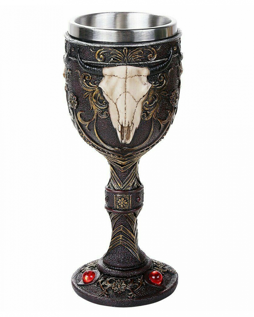 Gehörnter Stier Totenschädel Kelch als Halloween Tischdeko Dekoratives Trinkgefäß mit Büffelschädel als Verzierung Unser gehörnter Stier Totenschädel Kelch sorgt für eine morbide Western Stimmung auf deinem Halloween Buffet. Mit dem Büffelkopf Schädel als Verzierung könnte der Trinkkelch dessen geliebtes Longhorn nun durch die Hallen spukt. Hörst du ihn schnauben? Der gehörnte Stier Totenschädel Kelch ist aus hochwertigem Polyresin gegossen. Der Stiel und Körper bieten prunkvolle Details wie die Ranken, rote Edelsteine und den Stierschädel. Der Kelch besitzt einen herausnehmbaren Edelstahleinsatz. Lieferumfang: 1 x Gehörnter Stier Totenschädel Kelch Farbe: Schwarz, Beige, Gold Größe: ca. 19,5 x 8 cm Füllmenge: 290 ml Material: Polyresin, Edelstahl Dekorativer Kelch mit Stierschädel als Motiv Goldfarbene Schnörkel und Acryl Glasperlen als Verzierung Herausnehmbarer Edelstahleinsatz zum leichten Reinigen Fantastische Halloween Deko und Geschenkartikel