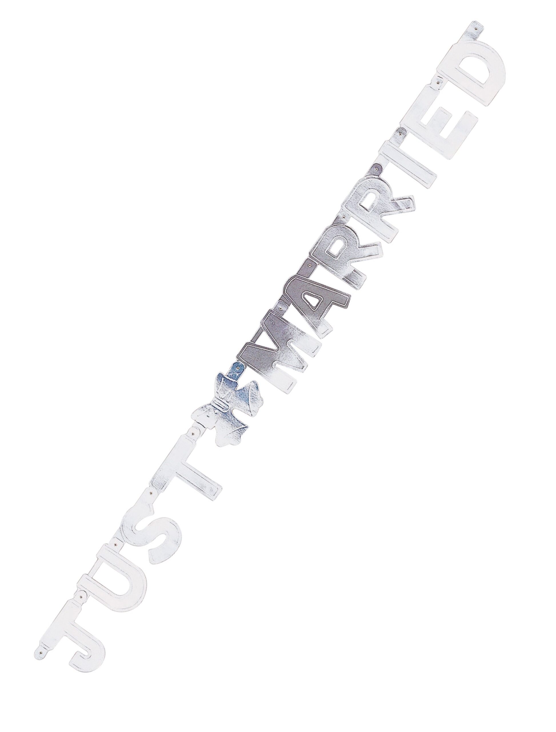 Eine Just Married Girlande in Silber mit einer Länge von 129 cm. Die Buchstaben haben eine Größe von ca. 10,7 cm. Frisch verheiratet, frisch vermählt. Die perfekte Dekoration für die Hochzeit.