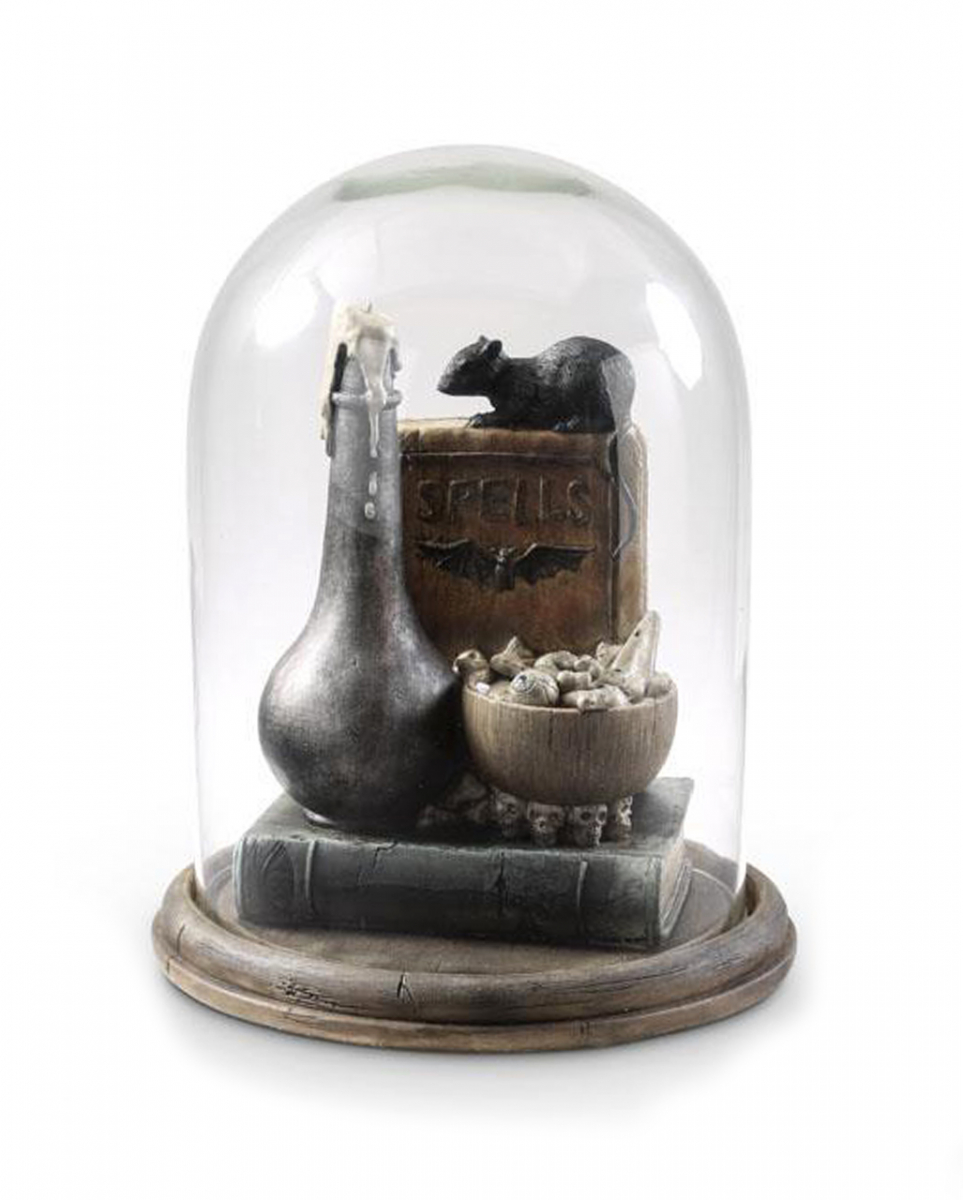 Ratte und Zauberbuch in Glasglocke 31cm Edle Halloween Dekoration mit Zauberbüchern, Ratte und Zaubertrank Unsere Ratte und Zauberbuch in Glasglocke macht richtig Lust auf Halloween. In der Glasglocke stapeln sich zwei Zauberbücher, eine neugierige Ratte sowie eine Schale mit Zutaten für den nächsten Hexensud und eine Zaubertrank Flasche mit Kerze. Das ist eine einzigartige Gothic Deko für Halloween und den düsteren Alltag. Die Ratte und Zauberbuch in Glasglocke ist ca. 31 cm hoch und hat einen Durchmesser von ca. 24cm. Die eindrucksvolle Halloween Dekoration wird damit zum Eyecatcher in deiner Hexenküche. Die abnehmbare Glocke ist aus Glas und die Figuren sind aus hochwertigem Polyresin gegossen und von Hand bemalt. Lieferumfang: 1 x Ratte und Zauberbuch in Glasglocke 31cm Farbe: Braun, Beige, Grau, Schwarz Größe: ca. 31 x 24 x 24 cm Material: Polyresin (Kunststein), Glas Gegossen aus hochwertigem Polyresin Perfekt für Fans von stilvoller Halloween Deko