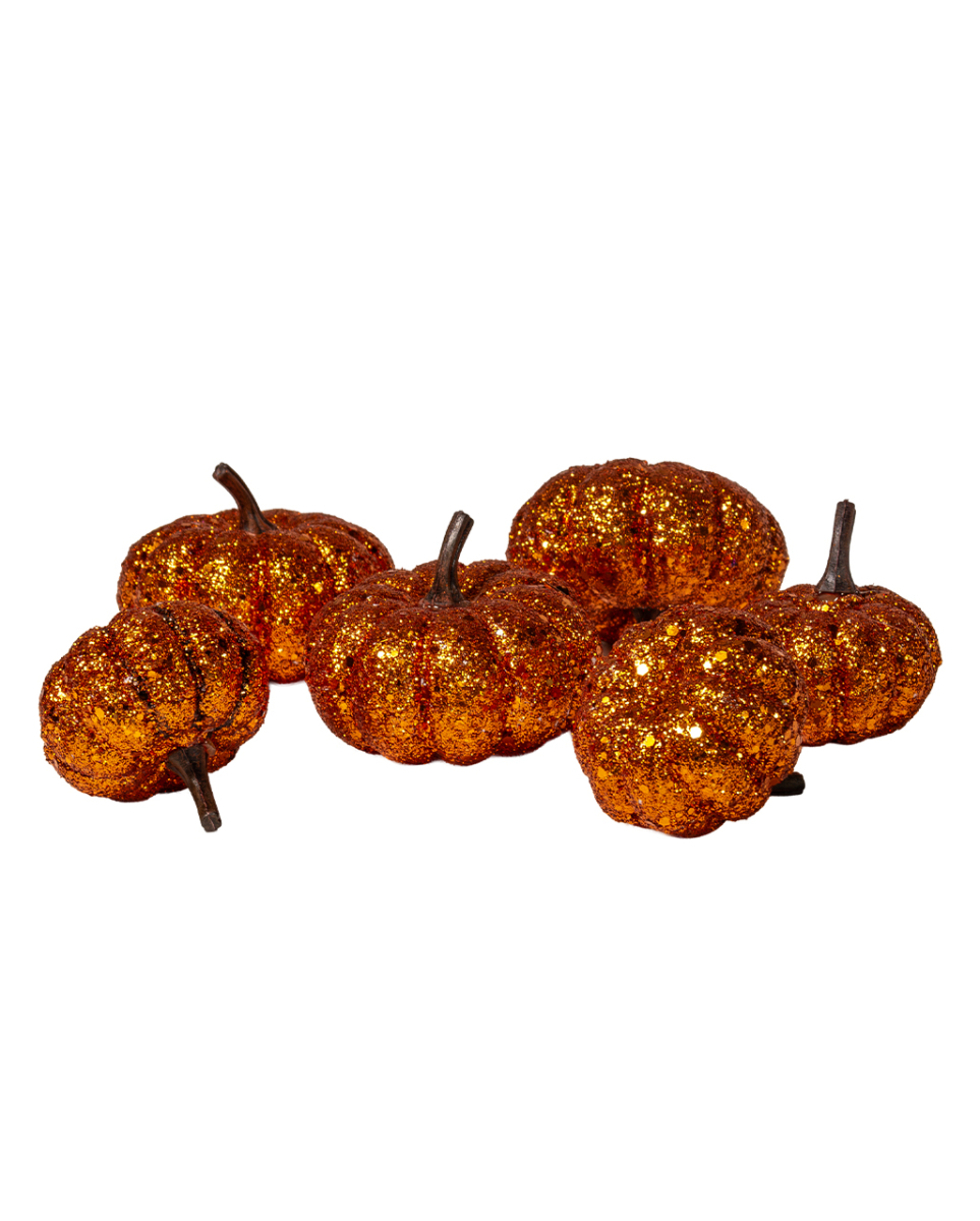 Kleine Glitzer Kürbisse 6 St. Orange glitzernde Pumpkin-Deko für ein edles Halloween-Ambiente Diese schimmernden kleinen Glitzer Kürbisse sind wie kleine Lichtfänger, die jeden Raum mit der Wärme und dem Glanz eines goldenen Herbsttages erfüllen. Perfekt als zauberhafter Blickfang auf Tischen oder Fensterbrettern, bringen sie die Magie des Herbstes spielerisch zu dir. Das Set besteht aus insgesamt 6 Glitzer Kürbissen in zwei verschiedenen Größen – drei große und drei kleinere. Jeder Kürbis ist mit feinem Glitzer überzogen und ist super dekorativ. Du kannst sie als Streudeko auf dem Tisch platzieren, in herbstlichen Arrangements verwenden oder als glitzernden Akzent auf dem Kaminsims drapieren. Lieferumfang: 1 x Kleine Glitzer Kürbisse 6 St. Inhalt: 3x Große, 3x Kleine Farbe: Orange, Braun Größe: Großer Kürbis: ca. 8 x 5 cm, Kleiner Kürbis: ca. 6 x 4 cm Material: Polystyrol, Kunststoff Strahlende Glitzer Kürbisse als elegante Tischdeko für Halloween perfekt für Fans von einzigartiger Halloween Deko Perfekt als Streudeko für den Esstisch, in Vasen und Gefäßen oder auf dem Kaminsims