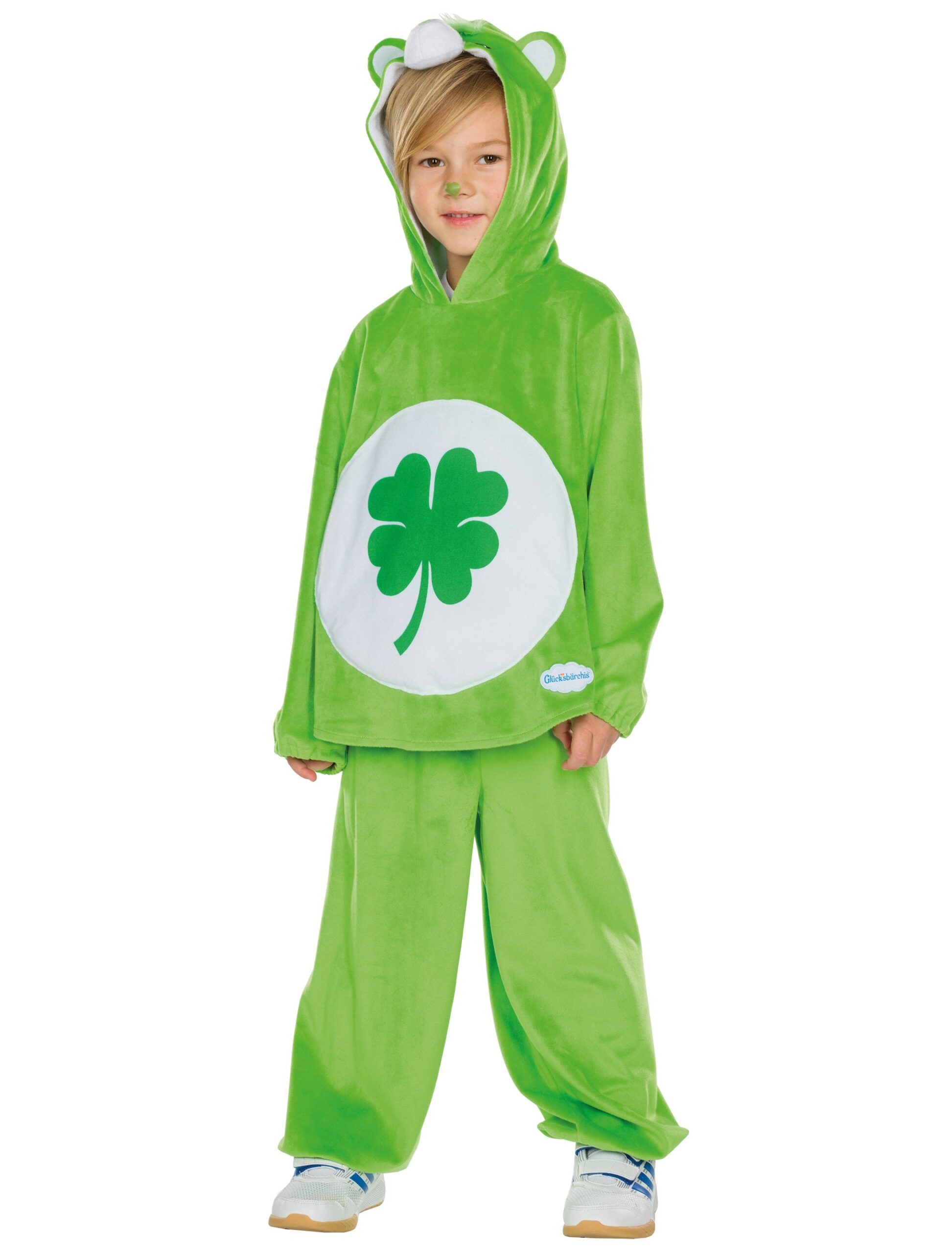 Wenn Du gerne Glück und Freude an Karneval verbreitest, dann hole Dir jetzt unser tolles Glücksbärchi Outfit in Grün. Das zweiteilige Bär Kostüm für Kinder, das aus einer Hose und einem Oberteil besteht, eignet sich prima zum Verkleiden an Fasching, aber auch auf Mottopartys bist Du damit gut gerüstet. Ein riesiges Kleeblatt ziert die Front des Oberteils, dessen Kapuze aus einem niedlichen Glücksbärchi Gesicht besteht. Das Kostüm ist ein offizielles Glücksbärchis Merchandise Produkt für Kinder, das besonders hochwertig hergestellt wurde. Auch Deine Nase kannst Du passend in Grün an Karneval schminken. Bei dem Kostüm handelt es sich um offiziellen Disneys Gummibärenbande Merchandise.