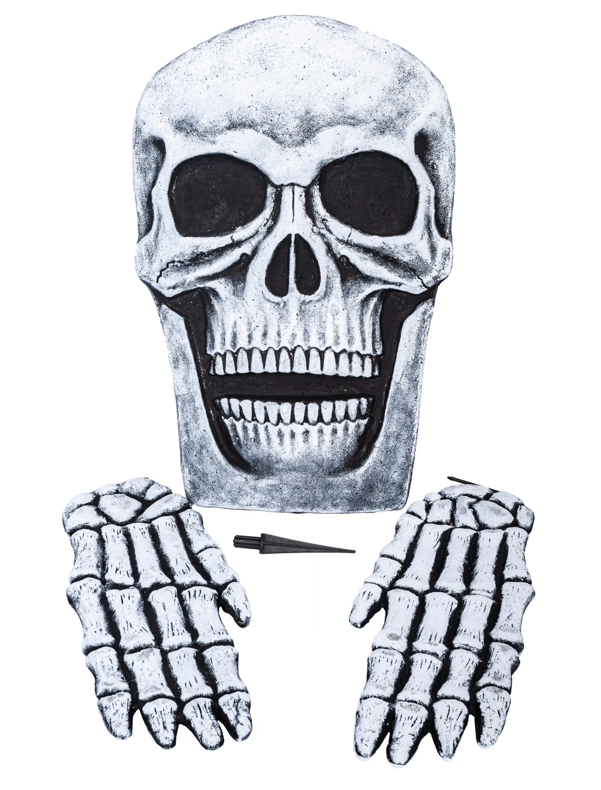 Untote, Hexen und andere schaurige Gestalten möchten bei Deiner nächsten Halloween Party sicher nicht auf ein gruseliges Ambiente verzichten. Ein Totenschädel Grabstein mit Händen, die plötzlich auftauchen, um das nächste Opfer in die Tiefe zu zerren, ist garantiert eine passende Halloween Deko für Deine Feier. Und das Beste daran ist, Du musst Dich nicht mit einem schweren Stein abschleppen, diese Garten Deko Grabstein ist leicht wie eine Feder.