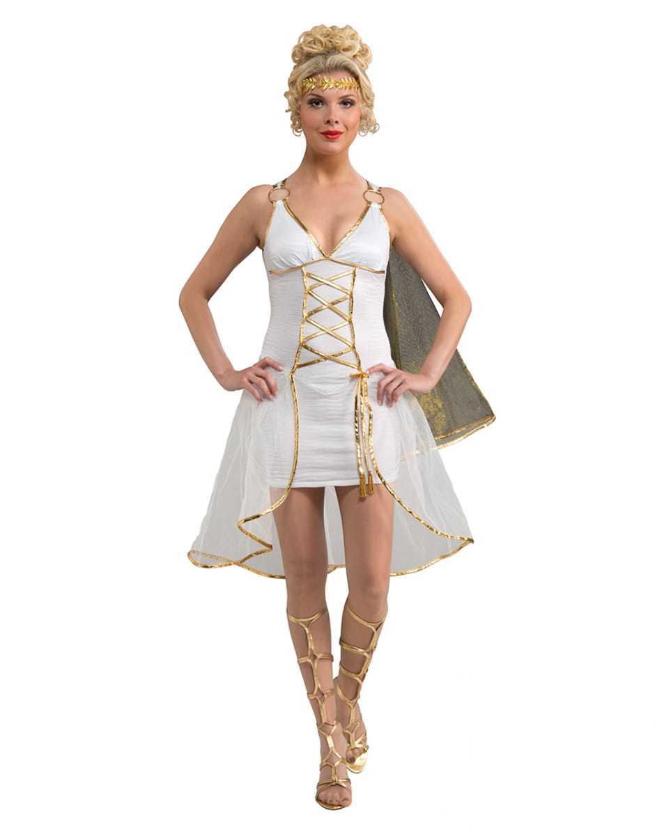Griechische Göttin Kostüm mit Lorbeerkranz für deine Verkleidung als Aphrodite Göttinnen Kostüm für Damen als Faschingsverkleidung Das Griechische Göttin Kostüm mit Lorbeerkranz für deine Verkleidung als Aphrodite macht dich zur Göttin der Liebe. Mit dem Aphrodite Kostüm wirst du zum strahlenden Mittelpunkt auf dem Olymp und dich vor Verehrern kaum retten können. Das Griechische Göttin Kostüm mit Lorbeerkranz für deine Verkleidung als Aphrodite besteht aus einem gold-weißen Aphrodite Kostümkleid mit Schal und einem Lorbeerkranz als Kopfschmuck. Der Kostümstoff ist sehr luftig und leicht und liegt angenehm auf der Haut. Du bekommst die Aphrodite Verkleidung in XS-L Größe. Trage hierzu goldene High Heels und das Kostüm ist komplett! Lieferumfang: 1 x Griechische Göttin Kostüm mit Lorbeerkranz Inhalt: 1x Kostümkleid mit Schal, 1x Lorbeerkranz Farbe: Weiß/Gold/Schwarz Größe: XS, S, M, L Material: 100% Polyester Größe: XS (32-34) S (36-38) M (40-42) L (44-46) Brustumfang ca. 79-80 cm ca. 81-86 cm ca. 89-94 cm ca. 96-102 cm Taillenumfang ca. 58-61 cm ca. 63,5-69 cm ca. 71-76 cm ca. 79-84cm Achtung: Der Artikel ist ein Kostüm für Erwachsene und kein Spielzeug. Nicht für Kinder unter 3 Jahren geeignet. Kann Kleinteile enthalten, die verschluckt werden können – Erstickungsgefahr. Von Feuer und offenen Flammen fernhalten.