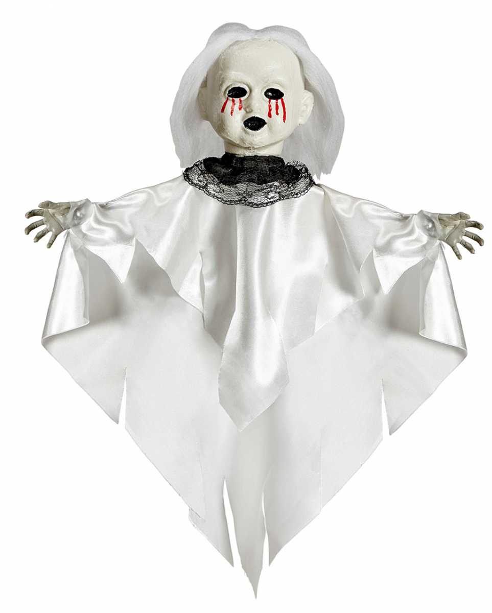 Spooky Gruselpuppe als Hängefigur 50cm als Halloween Deko Unheimliche Geisterpuppe mit blutigen Augen für deine Spukhaus Deko Mit der spooky Gruselpuppe als Hängefigur sorgst du an Halloween für Gänsehaut. Das fahle Gesicht und die blutigen Tränen lassen übles ahnen. Die Geisterpuppe verbreitet echtes Spukhaus Feeling. Dabei will sie nur mit euch feiern. Happy Halloween! Die spooky Gruselpuppe als Hängefigur besteht aus einem weißen Stoffgewand und einem Kunststoff Puppenkopf mit schwarzen Lippen und Augen, aus denen es blutet. Biege die Arme so zurecht, als würde sie nach euch greifen, um euch ins Verderben zu zerren. Lieferumfang: 1 x Spooky Gruselpuppe als Hängefigur 50cm Farbe: Weiß, Beige, Schwarz, Rot Größe: ca. 50 cm Material: Kunststoff, Polyester Preiswerte Gruselpuppe als Halloween Deko Biegsame Arme zum Positionieren der Hände Ohne Sound, Bewegung und Beleuchtung