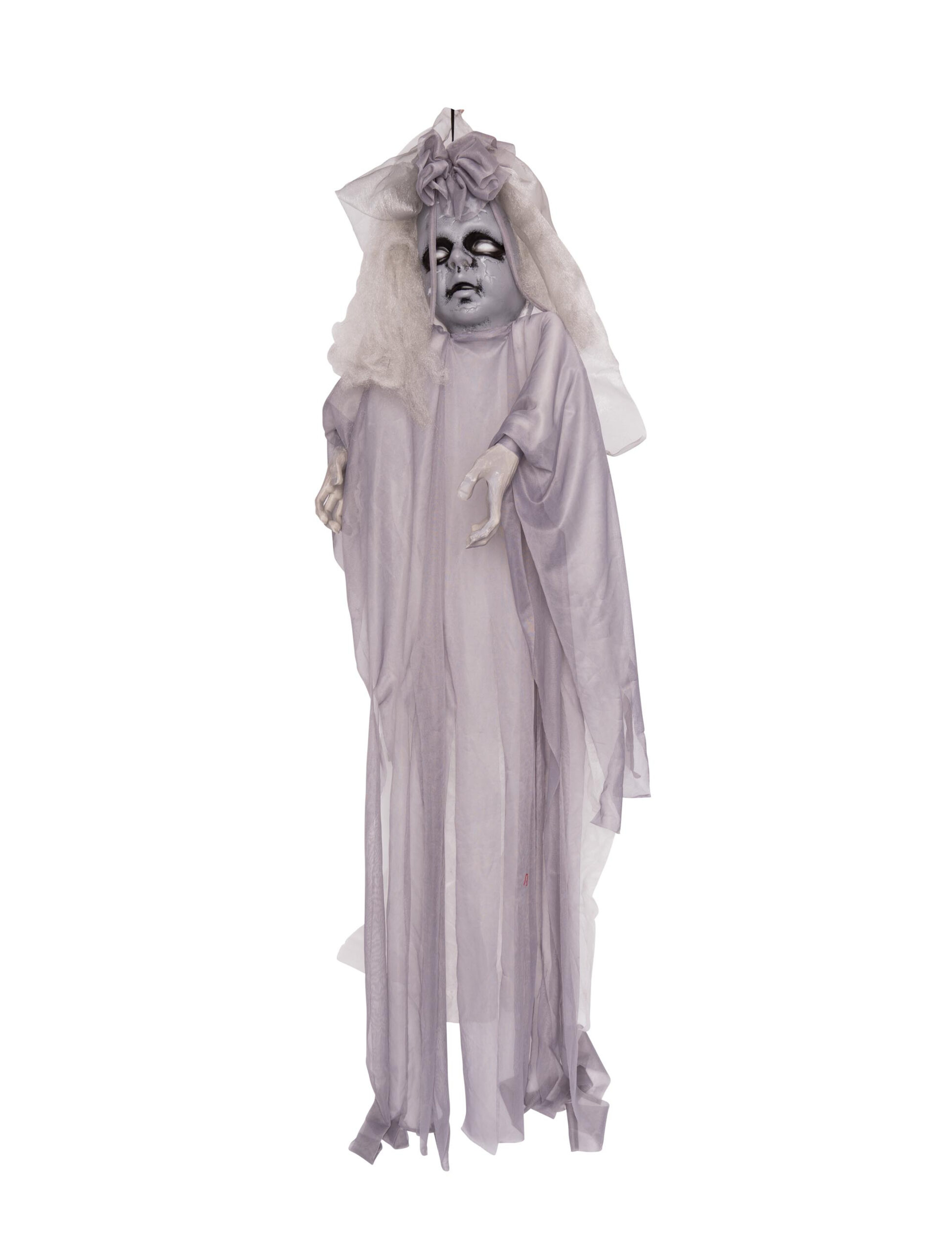 Auf einer gruseligen Party darf natürlich die Dekoration nicht fehlen. Du hast keine Lust etwas selbst herzustellen? Dann schau Dir dieses gruselige, hängende Mädchen an. Diese grau-weiße Hängefigur kann überall aufgehängt werden und sorgt, mit ihren 130 cm, garantiert für einen schaurigen Schrecken, der den meisten sicherlich in Erinnerung bleiben wird.