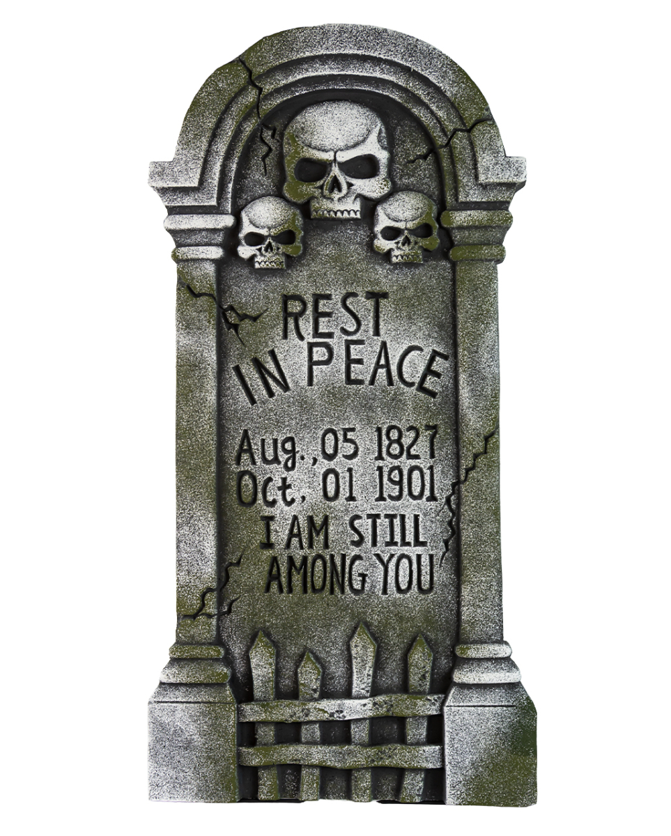 Gothic Grabstein mit 3 Totenköpfen und Inschrift Halloween-Deko für den Garten Unser Gothic Grabstein mit 3 Totenköpfen und Inschrift ist ideal als Gartendeko für Halloween. „Rest in Peace“ und „I am Still Among You“ zieren den Grabstein, ebenso wie 3 stumm blickende Totenkopf Fratzen. Der Gothic Grabstein mit 3 Totenköpfen und Inschrift ist 91 cm groß. Er besteht aus Polyfoam und besticht durch seine authentisch nachgearbeitete Stein-Optik. Der Deko-Grabstein ist sehr leicht und kann mittels Erdspieße in den Garten gesteckt werden. Lieferumfang: 1 x Gothic Grabstein mit 3 Totenköpfen und Inschrift 91cm Farbe: Grau, Weiß, Schwarz, Olive Größe: ca. 91 x 46 x 4,5 cm Gewicht: 375 g Material: Polyfoam Vermoderter Halloween Grabstein als Friedhofs Partydeko Risse und Kerben sorgen für den realistischen Look Schriftzug ",Rest in Peace", und ",I am Still Amon You", sowie Datumsangabe als Blickfang Leichtes Gewicht Inkl. 2 Erdspieße aus Kunststoff als Halterung für weiche Erde Ideal für Innen- und Außendekoration