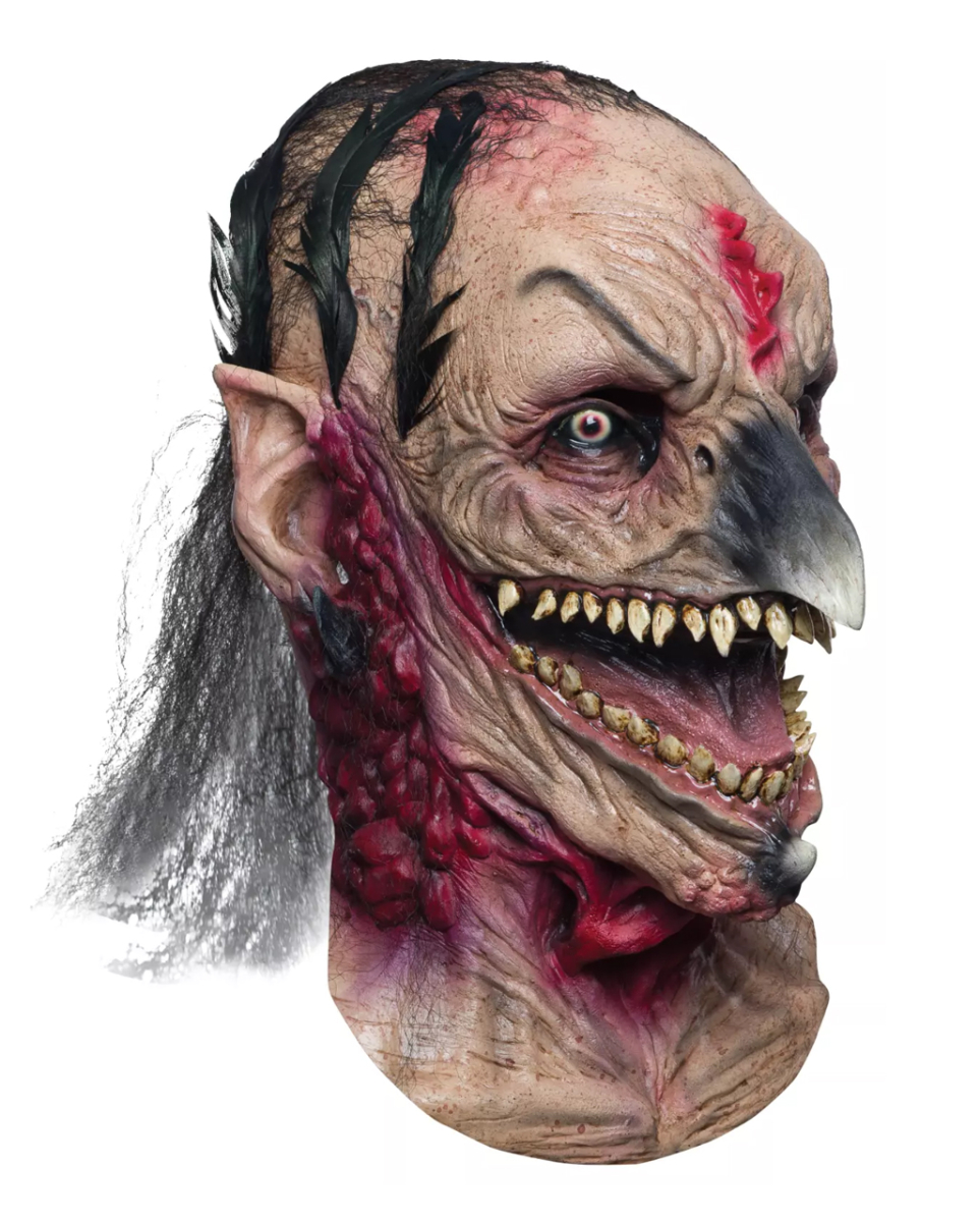 Harwitch Hexenmaske aus Latex mit Kunsthaar Vogel-Mensch-Maske mit Blut und Kunsthaar für Halloween und Fasching Trage die Hartwich Hexenmaske aus Latex mit Kunsthaar und sorge auf der kommenden Halloween Party für Entsetzen. Die Mensch-Vogel-Maske ist ein schockierendes Accessoire, das für spitze Schreie sorgt. Unsere blutige Horror Fantasy-Maske mit Schnabel besteht aus Latex und ist von Hand bemalt. Sie zeigt verklebtes Kunsthaar, das in Fetzen hängt sowie spitze Ohren, Reißzähne und böse Gesichtszüge. Lieferumfang: 1 x Harwitch Hexenmaske aus Latex mit Kunsthaar Farbe: Beige, Violett, Rot, Schwarz Größe: Vollkopfmaske Material: Latex, Kunsthaar Rabe-Mensch-Maske mit Schnabel und spitzen Zähnen Spitze Ohren, zottiges Kunsthaar und gefährlich aussehende Augen als Blickfang Realistische Hybrid-Horrormaske, die eine Mischung aus Krähe und Hexe darstellt Fantasy-Horror-Maske Von Hand bemalt