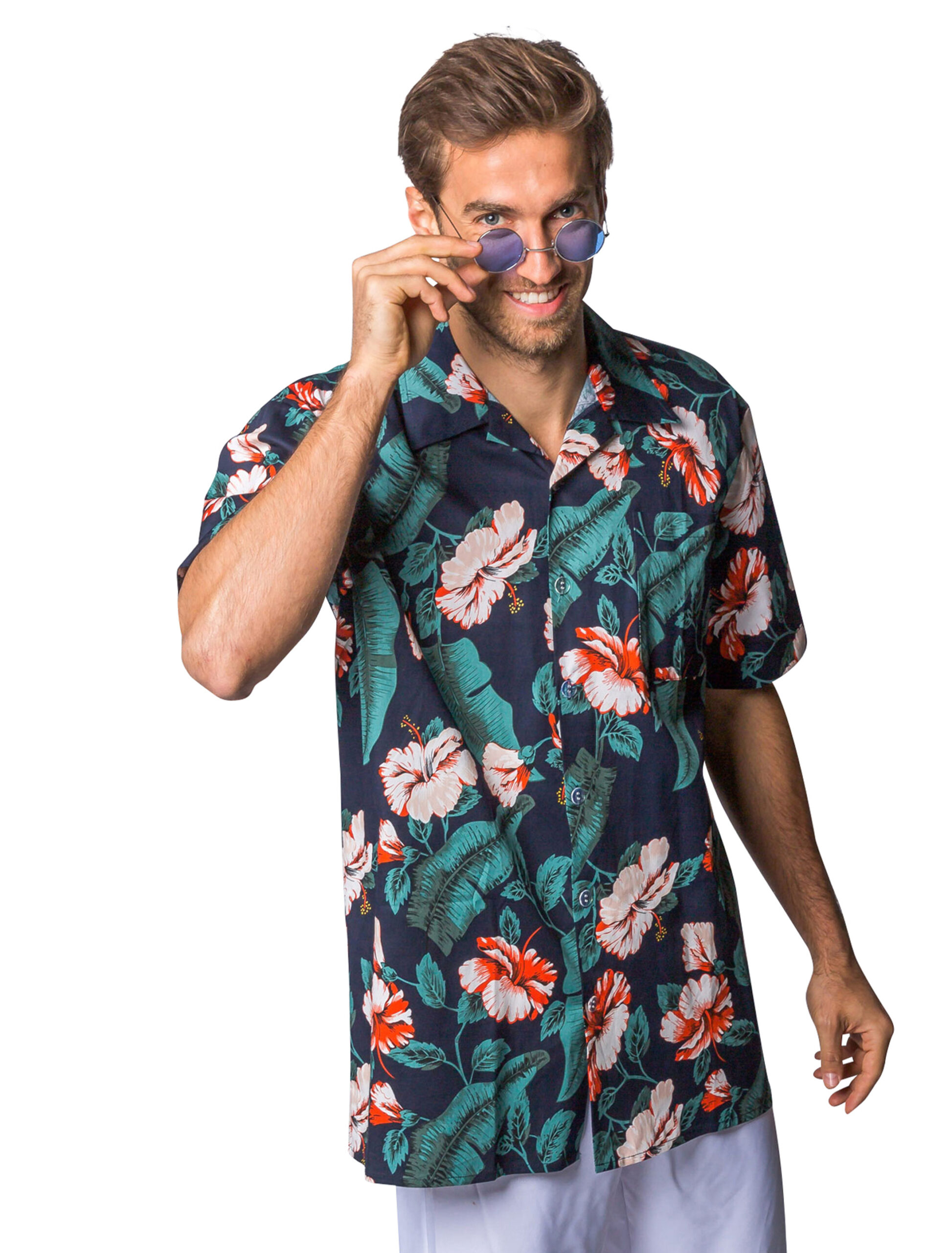 Die nächste Sommerparty kommt bestimmt! Wie gut, dass Du mit diesem farbenfrohen Hemd bestens vorbereitet bist. Das lockere und coole Hawaii-Hemd für Herren besteht aus einem dunkelblauen Stoff, der rundum mit vielen grünen Blättern und rosafarbenen Hibiskusblüten verziert ist. Das bequeme und aus 100 % Baumwolle bestehende Oberteil besitzt eine Brusttasche und lässt sich durch die Knöpfe in der Front verschließen (oder nach Belieben auch offen tragen). Dazu passen besonders gut Hawaiiketten, Flip-Flops, ein Strohhut und weitere sommerliche Accessoires!