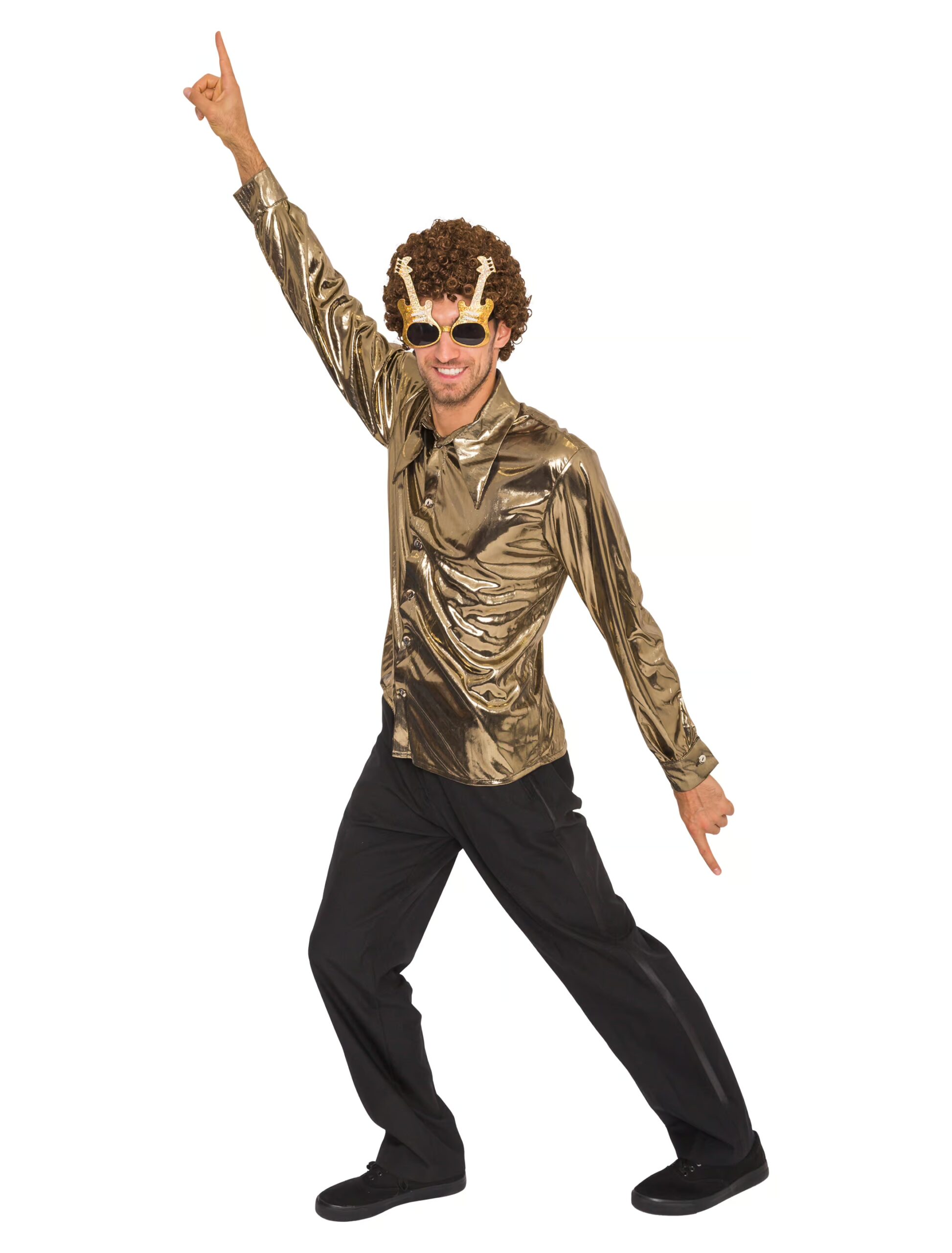 Mit diesem Hemd bist Du garantiert der Mittelpunkt auf jeder Karnevals-, Motto- oder Tanzparty! Das goldfarbene und glänzende Metallic-Hemd für Herren reflektiert jeden Lichtstrahl und lenkt so garantiert alle Blicke auf Dich. Der auffällige Kragen, der tiefe Ausschnitt und die Knopfleiste runden das schillernde Kleidungsstück gekonnt ab!