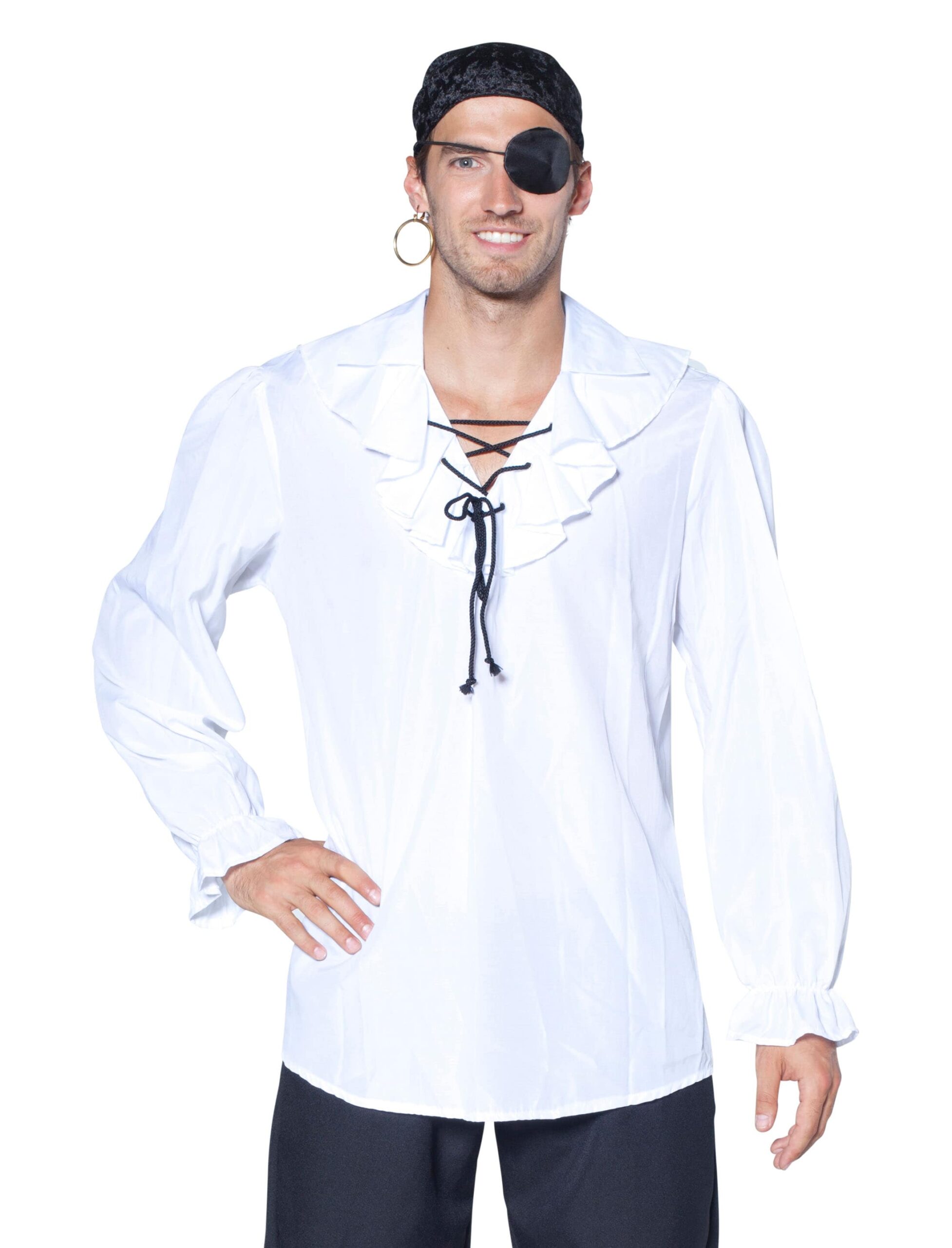 Ahoi Seeräuber… unser Piratenhemd ist aus einem weißen Stoff gefertigt. Die Front wird von Rüschen und einer Schnürung mit Metallösen geziert. Kombinierst Du das Hemd beispielsweise zu einem Piratenmantel, einer Kniebundhose, einem Dreispitz und ein paar räuberischen Piraten-Accessoires hast Du im Nu ein perfektes Freibeuter-Kostüm.