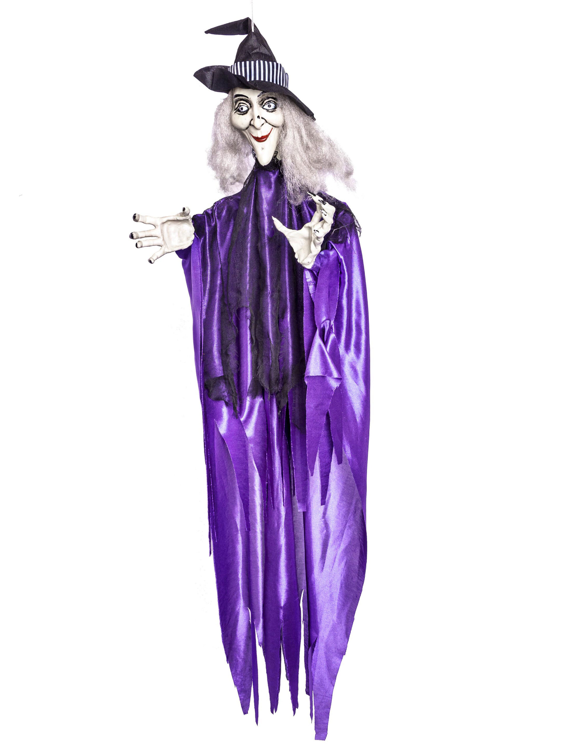 Mit dieser fast lebensgroßen Hexe sind Dir staunende Blicke auf Deiner Halloween Party garantiert. Die etwa 1,3 m große Hexe trägt ein langes, lilafarbenes Gewand und einen schwarzen Hut. Mit einem Aufhänger, der am Hut befestigt ist, kannst Du die Hexe überall als Halloween Deko anbringen. Durch die beweglichen Arme kann die Hexe mit weiterer Party Deko, zum Beispiel einem Hexenbesen, kombiniert werden.