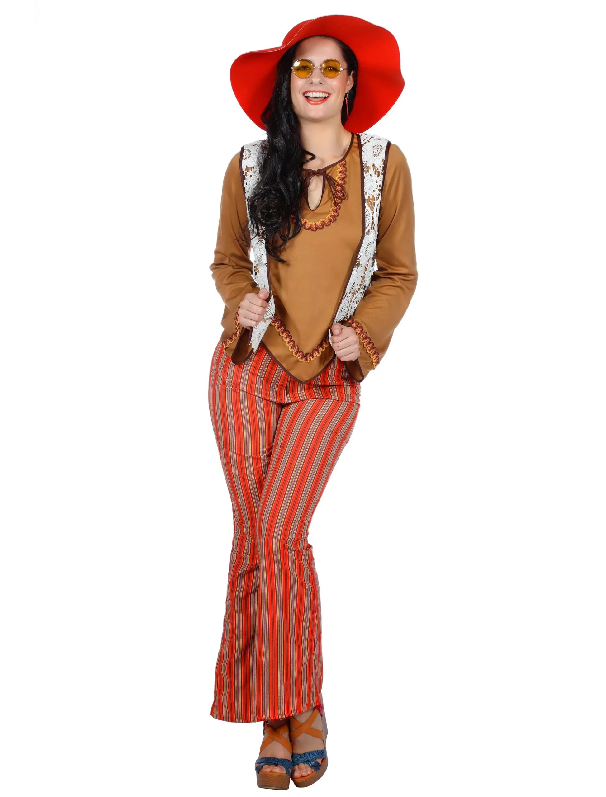 Mit diesem Dress bist Du perfekt gekleidet für eine Reise nach San Francisco! Stell Dir nur vor: Du am Steuer eines Bullis, der farbenfroh mit Blumen und Peace & Love-Symbolen bemalt ist, warmer Wind weht Dir durch das Haar und Du fühlst grenzenlose Freiheit und Liebe. Oder Du erscheinst einfach stylisch gekleidet auf der nächsten Motto-Party und erntest die Bewunderung der anderen Gäste. Denn mit der Kombination aus Hose, Oberteil und Weste machst Du als Hippie immer eine gute Figur, besonders wenn Du dieses Outfit noch mit einem zeitgenössischen Hut oder einer Sonnenbrille aus unserem Angebot verfeinerst.