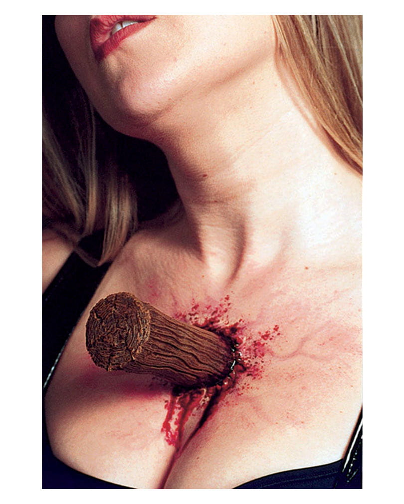 Holzpflock Latexapplikation Spezial Make-up Effekt für Halloween Professioneller Theater Make-up Effekt für Vampir Jäger und untote Blutsauger Mit der Holzpflock Latexwunde kannst du dich jetzt als Vampir schminken, der den Kampf mit einem Vampirjäger überlebt hat. Bringe den Holzpflock als Latexapplikation dazu an einer anderen Stelle, als über dem Herzen an, sodass der Angriff des Vampirjägers fehlgeschlagen ist. Die Latexapplikation ist ein fantastischer Spezial Make-up Effekt für Halloween. Die imposante Holzpflock Latexapplikation ist bereits coloriert und besteht aus hochwertigem Latex. Zum unterstützen der Form, die Latexapplikation am besten mit Watte oder Papiertaschentuch auspolstern und dann mit Mastix hautkleber oder Flüssiglatex auf die Haut montieren. Optional noch mit Flüssiglatex, Make-up und Filmblut die Übergänge kaschieren und fertig ist dein Halloween Make-up. Mastix Hautkleber, Flüssiglatex und Filmblut nicht inkl. Lieferumfang: 1 x Holzpflock Latexwunde Inhalt: 1 x Latexapplikation Farbe: Braun/Hautfarbe Material: Latex Mastix Hautkleber, Flüssiglatex und Filmblut nicht inkl.