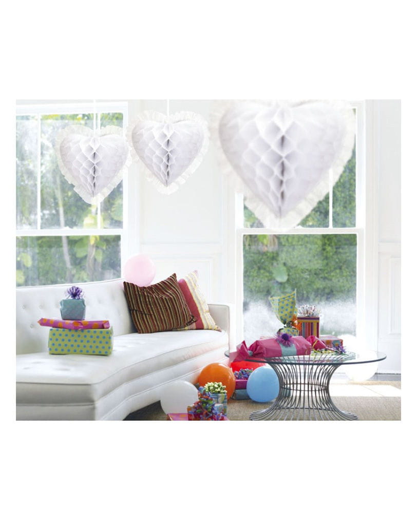 Honigwaben Dekoherz weiß mit Rüschen Engelsgleiche Hochzeitsdekoration mit dem 30 cm großen Papierherz! Das weiße Honigwaben Dekoherz mit Rüschen harmoniert fantastisch mit traditioneller Traufeier-Dekoration und bildet so eine runde Kombination mit weiteren Hochzeitsdekorationen. Das elegante Papierherz wird Herzen erweichen! Mit dem weißen Honigwaben Dekoherz mit Rüschen hast du ein romantisches Papierherz mit ganzen 30cm Größe. Durch die edlen Rüschen aus Organza wirkt das Dekoherz noch viel atemberaubender und kann über den Köpfen eurer Gäste seinen Charme ausstrahlen, indem es einfach mit der angebrachten Schlaufe dort aufgehängt wird. Mithilfe der angebrachten Klebestreifen wird aus einem flachen Papierherz im Handumdrehen ein dreidimensionales Wabenherz, das bei keiner Hochzeitsfeier fehlen darf. Lieferumfang: 1 x Honigwaben Dekoherz weiß mit Rüschen Inhalt: Honigwaben Herz (inkl. Klebestreifen zum Fixieren und Schlaufe zum Aufhängen) Farbe: weiß Material: Papier und Organza Edles Dekoherz mit schönen Rüschen als romantische Hochzeitsdeko Achtung: Der Artikel ist kein Spielzeug. Nicht für Kinder unter 3 Jahren geeignet. Kann Kleinteile enthalten, die verschluckt werden können – Erstickungsgefahr. Von Feuer und offenen Flammen fernhalten.
