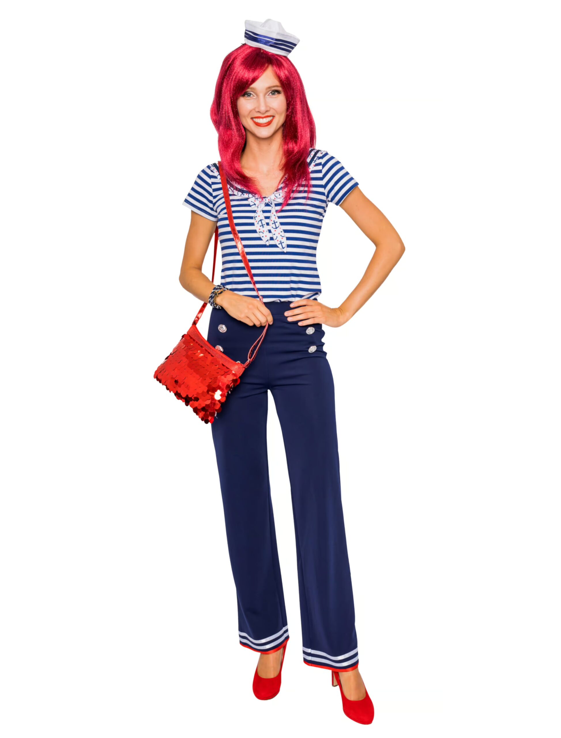 Ob als bezaubernde Matrosin oder als elegante Kapitänin, mit dieser schicken blauen Hose im Marine-Look wird Dein maritimes Faschingskostüm erst komplett. Die gerade geschnittene Hüfthose mit den beidseitigen silbernen Knöpfen und den horizontalen weißen Streifen an den Hosenbeinenden ist ein super Basic und kann mit Ringelshirt oder Kapitänsjacke aus unserem Shop prima kombiniert werden. So kannst Du als süße Martosin oder weltgewandte Kapitänin die närrische Männerwelt bezirzen und Dein persönliches Narrenschiff souverän durch die Turbulenzen des Karnevals steuern.