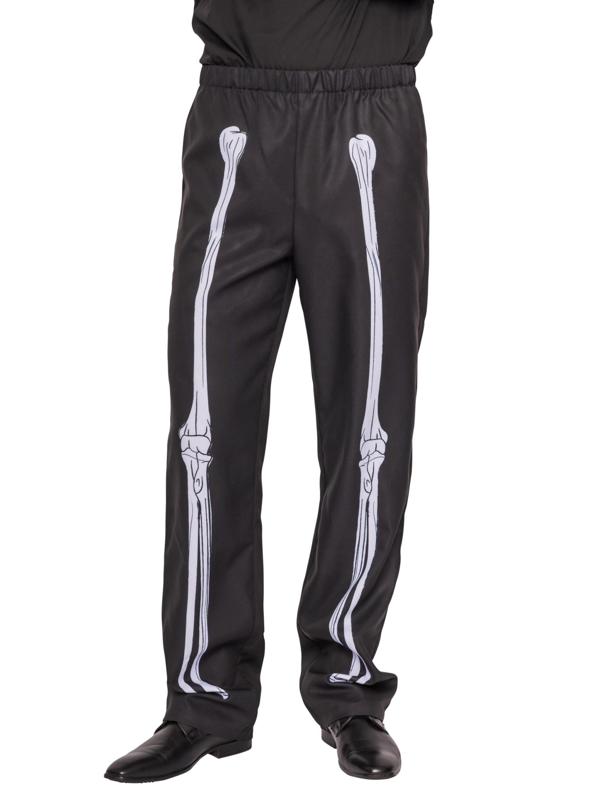 Die schwarze Hose mit Beinknochen-Aufdruck in der Front ist die perfekte Grundlage für ein unvergessliches Gruseloutfit. In Kombination mit der separat in unserem Shop erhältlichen Jacke mit Skelett-Muster bist Du der wohl angesagteste Untote auf jeder Kostümparty. Kombiniere dieses Outfit noch mit den passenden Accessoires aus unserem Shop wie Gesichtsschminke, Perücke, Hut und Totenkopf-Gehstock und die Partygäste werden selbst nach einiger Zeit noch von Deinem perfekten Zombiauftritt sprechen.