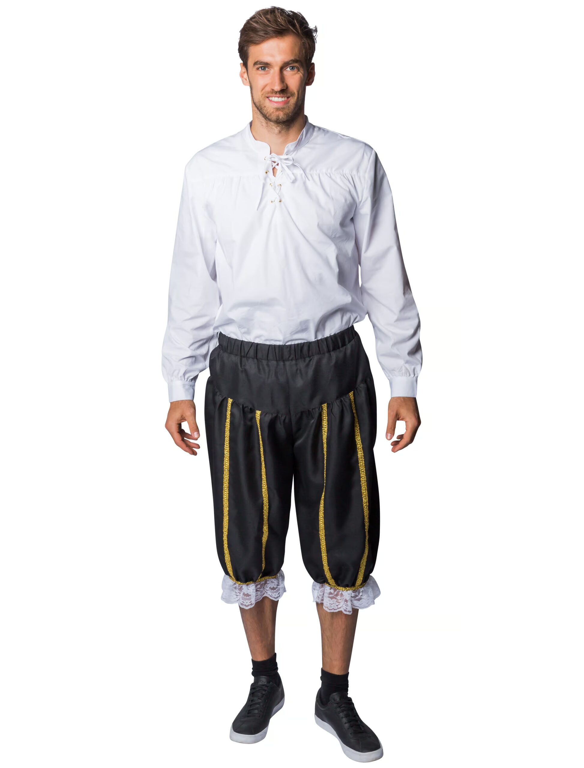 Wir haben da etwas für Dich, um Dein Musketier-Kostüm authentischer wirken zu lassen. Unsere knielange Hose Musketier für Herren, Kniebundhose, in Schwarz und Gold darf hier nicht fehlen. Die Hose hat einen breiten Gummizug und ist mit einer weißen Spitze abgesetzt. Ein schönes Kostümteil für Karneval und Fasching. Die Hose ist aus 100% Polyester gefertigt. Das Produkt beinhaltet nur eine Hose.