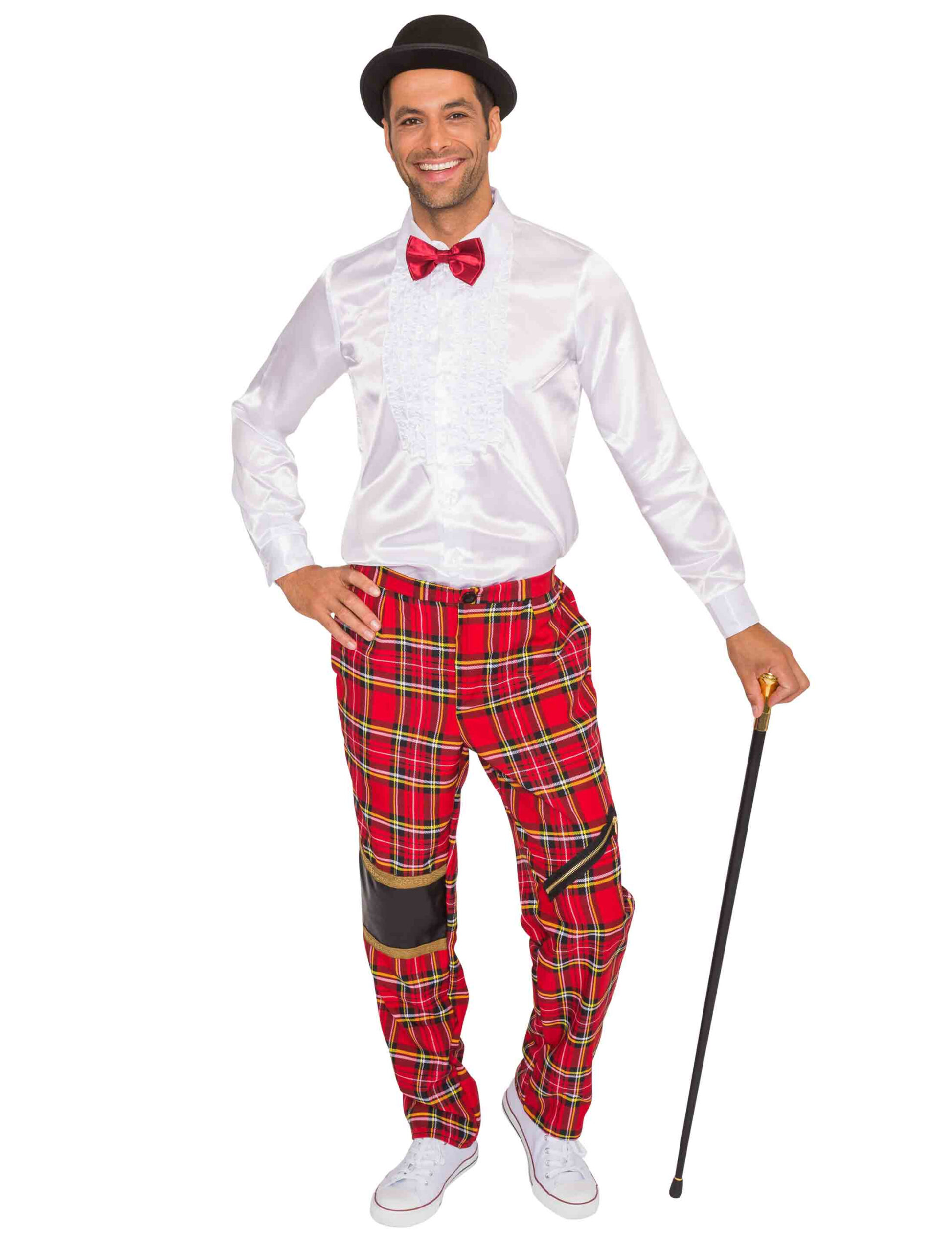 Du bist auf der Suche nach einer passenden Hose für ein Schotten-Outfit? Dann darf diese Schotten Hose deluxe nicht fehlen. Die karierte Hose ist mit einem schönen Schottenmuster bedruckt. An den Knien ziert auf der linken Seite ein Deko-Reißverschluss und an der rechten Seite wird das Karomuster mit einem schwarz-goldenen Stoffen abgegrenzt. Die Hose ist lang und locker geschnitten, besitzt vorne zwei Taschen sowie einen Knopf. Ein smarte Hose für Karneval und Fasching.
