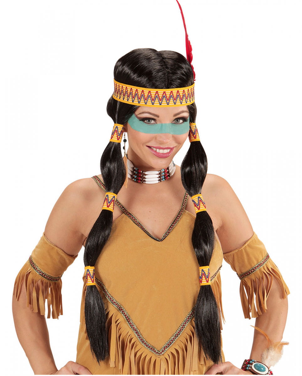 Indianerin Squaw Zopfperücke mit Stirnband und Federschmuck Indianer Zopfperücke – Faszinierender Look für Squaws und Häuptlingsladies Suchst du nach einem ausdrucksstarken Accessoire, das deinem Auftritt bei Fasching, Mottoparty oder Halloween das gewisse Etwas verleiht? Mit der Indianer Zopfperücke schlüpfst du im Handumdrehen in die Rolle einer stolzen Stammesfrau – kraftvoll, schön und geheimnisvoll. Die extralangen, glänzenden Zöpfe fallen sanft über deine Schultern, während das farbenfrohe Stirnband mit passender Feder deinem Look den letzten Schliff gibt. Perfekt für starke Frauen, die auffallen wollen – nicht nur am Lagerfeuer! Die Perücke besteht aus mittig gescheiteltem, schwarzem Kunsthaar, das in zwei langen Zöpfen geflochten ist. Jedes Haarband ist dreifach mit gelben Bändern und rot-blauem Muster verziert. Das ebenfalls gelbe Stirnband greift die Musterung wieder auf und wird durch eine rote Kunstfeder ergänzt, die ganz einfach eingesteckt werden kann. Die Einheitsgröße passt den meisten Damenköpfen bequem. Das Set besteht aus Kunsthaar, Polyester und Kunstfeder und ist das ideale Zubehör für dein authentisches Indianerkostüm. Lieferumfang: 1x Indianer Zopfperücke Inhalt: 1x Perücke, 1x Haarband, 1x Feder Farbe: Schwarz/Gelb/Rot/Blau Größe: Einheitsgröße für Damen Material: Kunsthaar, Kunstfeder, Bänder aus 100% Polyester Squaw Perücke mit Stirnband und Federschmuck Ideales Zubehör für dein Squaw-, Häuptlings- oder Wild-West-Kostüm