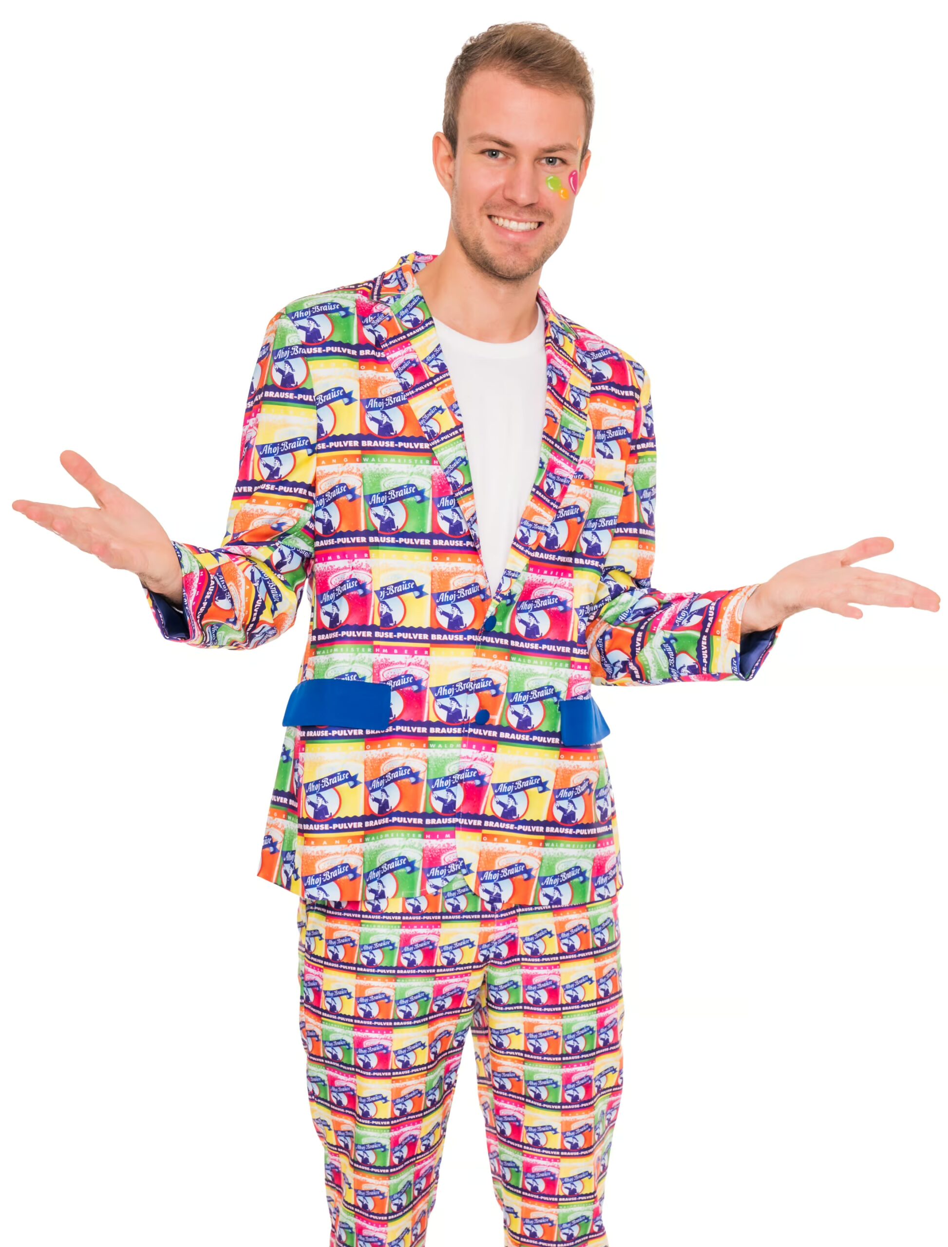 Ahoj-Brause! Mit dem Original Ahoj-Brause Sakko siehst Du richtig fesh aus und wirst ein echter Hingucker sein. Die kunterbunte Jacke im Ahoj-Brause Tütchen-Print versprüht eine echt prickelnde Leidenschaft. Das Jacket ist mit zwei stoffüberzogenen Knöpfen versehen und besitzt zwei Taschen sowie eine angedeutete Brusttasche. Die Innenseite der Jacke ist in Blau gehalten. In Kombination der neuen Ahoj-Brause Hose machst Du Dein Ahoj-Brause Kostüm komplett. Jetzt online bestellen und die prickelnde Karnevalsparty kann steigen! Exklusiv bei uns. Offizielles Merchandise!