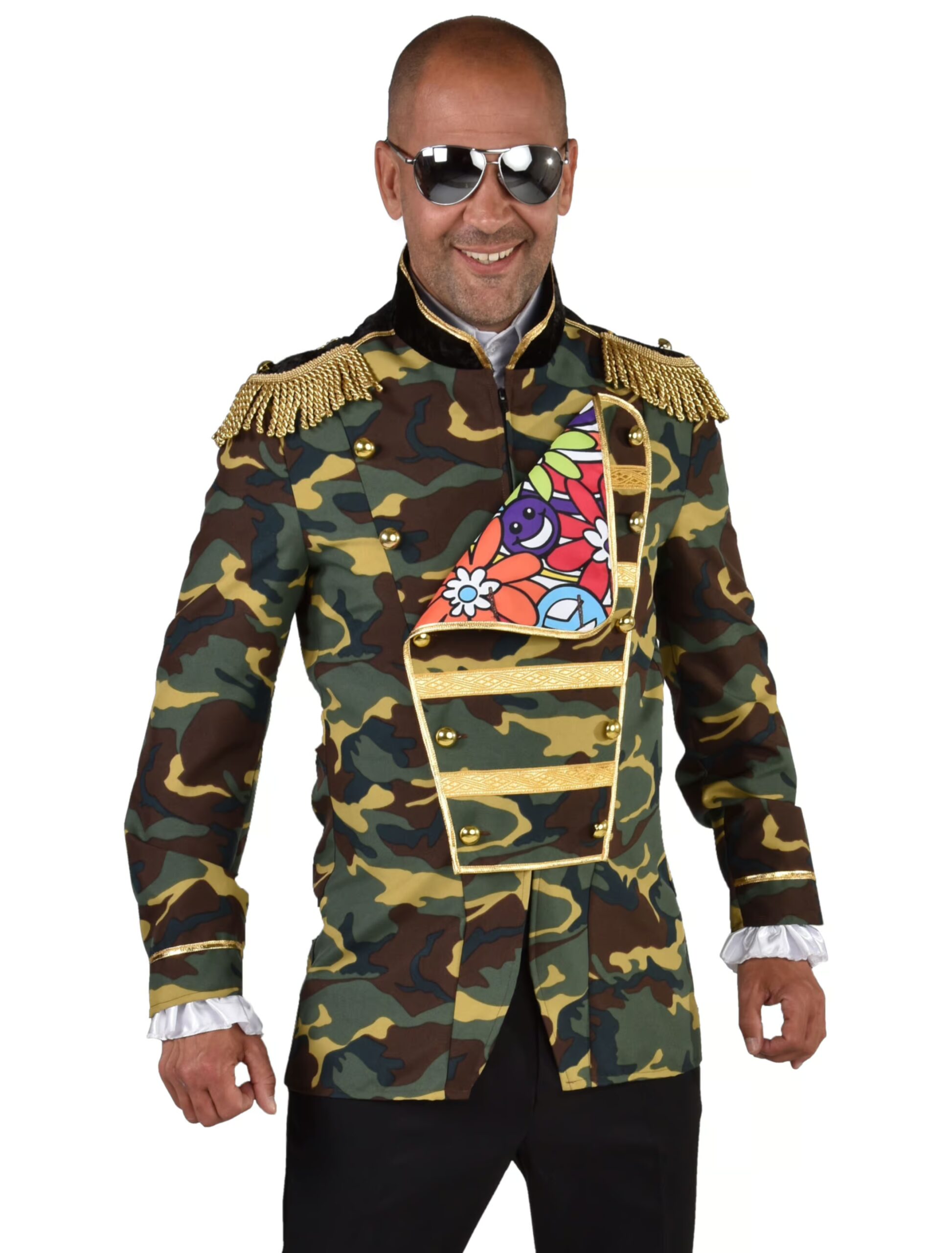 Da muss man doch zweimal hinschauen! Diese Camouflage-Jacke für Herren in den charakteristischen Farben grün, braun, beige und schwarz wird von vielen goldfarbenen Details wie Knöpfen, Ziernähten, Borten und Schulterklappen geziert. In der Front befindet sich ein Reißverschluss, der von einem Stoff verdeckt werden kann. Die Rückseite dieses Stoffes ist mit vielen bunten Blumen und lachenden Smileys verziert, die einen tollen Kontrast zu dem ansonsten seriösen Kostüm bilden. Ein überraschender Hingucker, mit dem vermutlich niemand rechnet!
