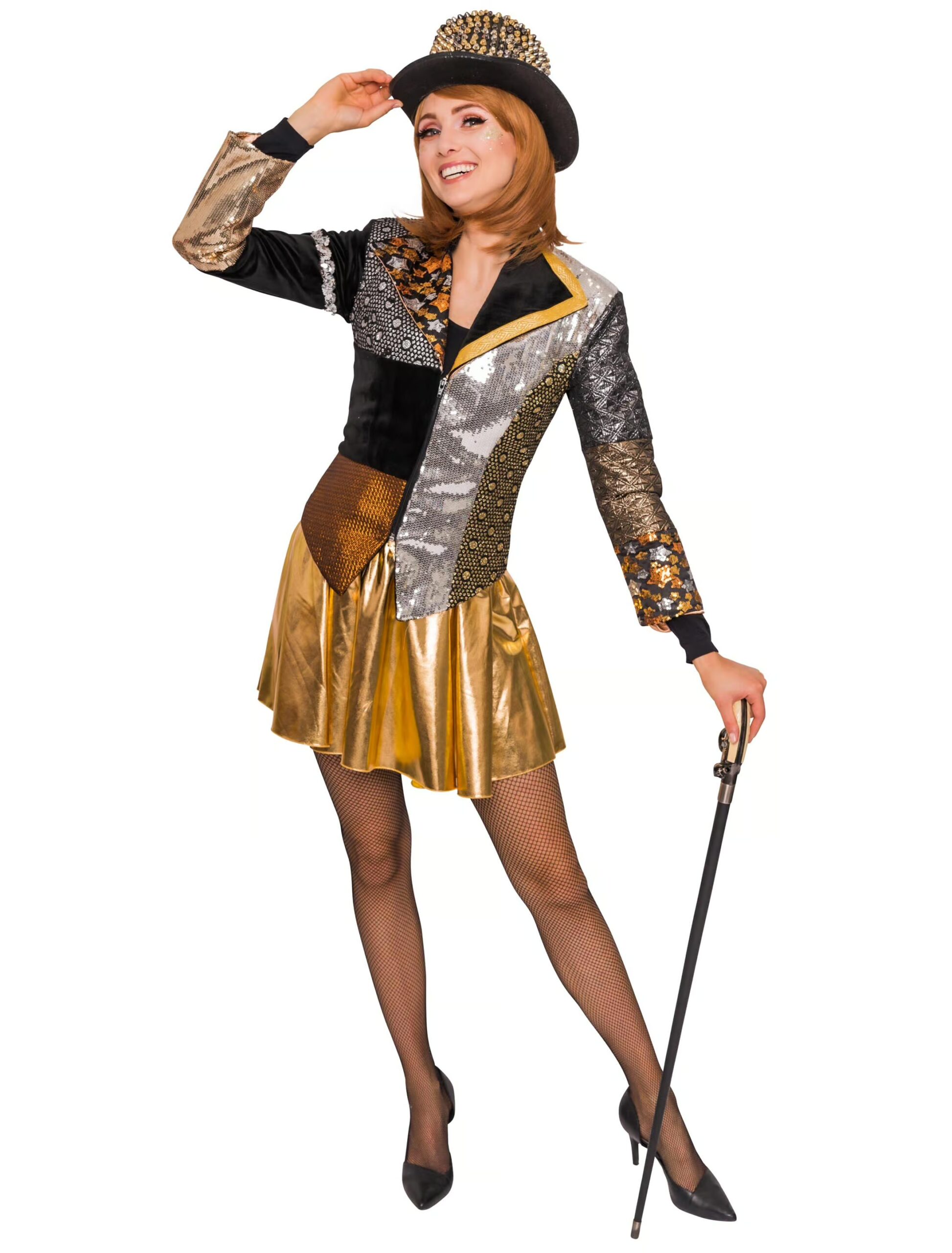 Mit dieser prächtigen, figurbetonten Damenjacke metallic schwarz-gold aus Polyester ziehst Du nicht nur die Blicke der Herren, sondern auch die der Damen auf Dich. Die schicke Jacke glänzt und schimmert nach allen Seiten. Die asymmetrisch angeordneten Farbflächen in Gold, Silber und Schwarz mit ihren unterschiedlichen Mustern und Strukturen machen den besonderen Reiz dieser Jacke aus. Sie ist eine überaus wirkungsvolle Ergänzung zu Show-Kostümen. Du kannst sie aber auch mit jedem anderen Kostümteil aus unserem Shop kreativ und individuell kombinieren. Exklusiv Artikel.