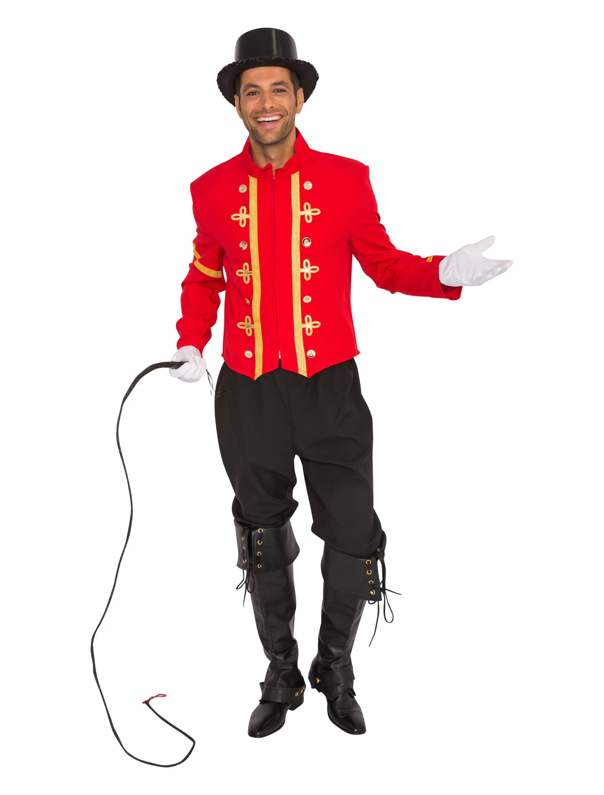 Manege frei für die feurig rote Herrenjacke für Dompteure. Das Accessoire für Fasching und Karneval bringt jeden Zirkus zum Rollen und kann in vielen Größen bei uns von Dir bestellt werden. Dazu passt ein Zylinder und eine lederne Peitsche, mit der Du alle wilden Tiere auf der Party bändigen kannst. Die rote Jacke aus Polyester hat tolle goldene Knöpfe und kann prima mit schwarzen Stiefeln aus Leder kombiniert werden. Finde heraus, ob Du damit alle Tiere in der Arena unter Kontrolle hast. Bestelle noch heute die tolle Dompteur Jacke für Herren für Halloween oder die nächste Mottoparty zum Thema Zirkus. Exklusiv Artikel.