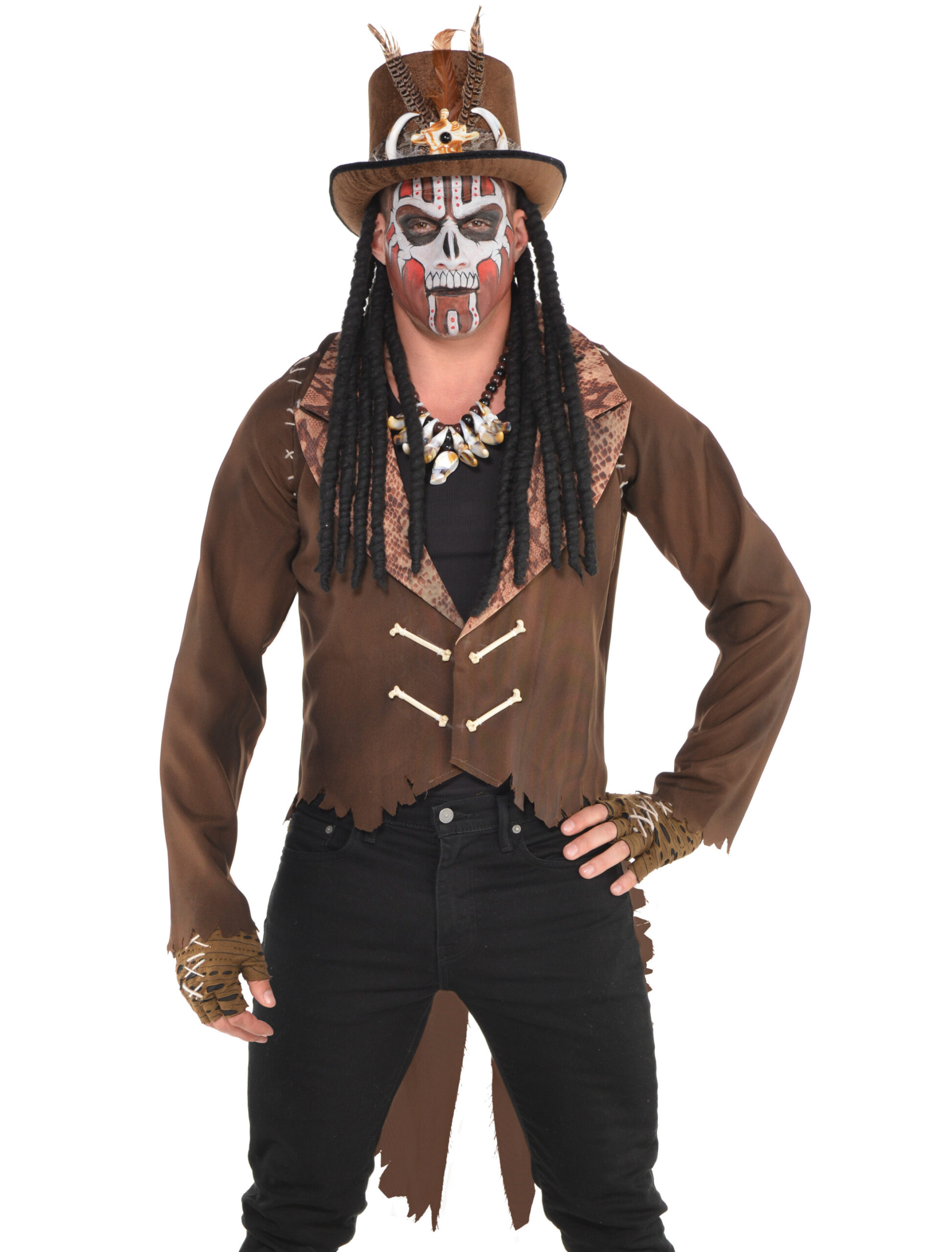 Als gruseliger Hexenmeister verkleidet und die nächsten Partys unsicher machen. Mit dieser Geisterbeschwörer Jacke wirst Du zu einem echten Hingucker auf jeder Halloween Party. Die Jacke ist aus 100% Polyester gefertigt und ist in einem Braun-Ton gehalten. Das Revers ist mit einem Schlangenhaut-Motiv bedruckt, die Säume sind ausgefranst und kleine Knochen zieren die Front des Fracks. Mit Hilfe von zwei Haken wird die Jacke in der Front verschlossen. Jetzt fehlen Dir nur noch ein paar Accessoires, wie ein Zylinder, ein Gehstock und Schmuck aus Knochen, die das Kostüm richtig aufwerten. Bei uns findest Du alles, wenn es um Dein Kostüm geht! Stöbere einfach durch unseren prall gefüllten Onlineshop!
