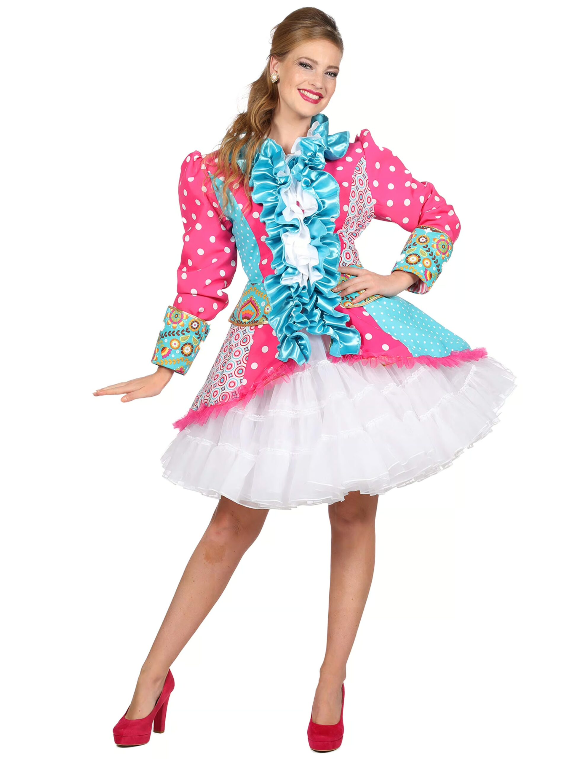 Die bunte Jacke Jilian für Damen ist ein echter Blickfang und sorgt für gute Stimmung auf jeder Karnevalsparty. In vielen Größen kannst Du das Modell für extravagante Ladys bestellen und das fesche Oberteil mit einem farbenfrohen Hut und Rock kombinieren. Viele Punkte, Blumen und Karomuster zieren optisch ansprechend die Jacke für Frauen und machen sie zu einem tollen Basic-Top für jede Verkleidung. Dazu passt ein verspieltes Make-Up für den Karnevalszug.