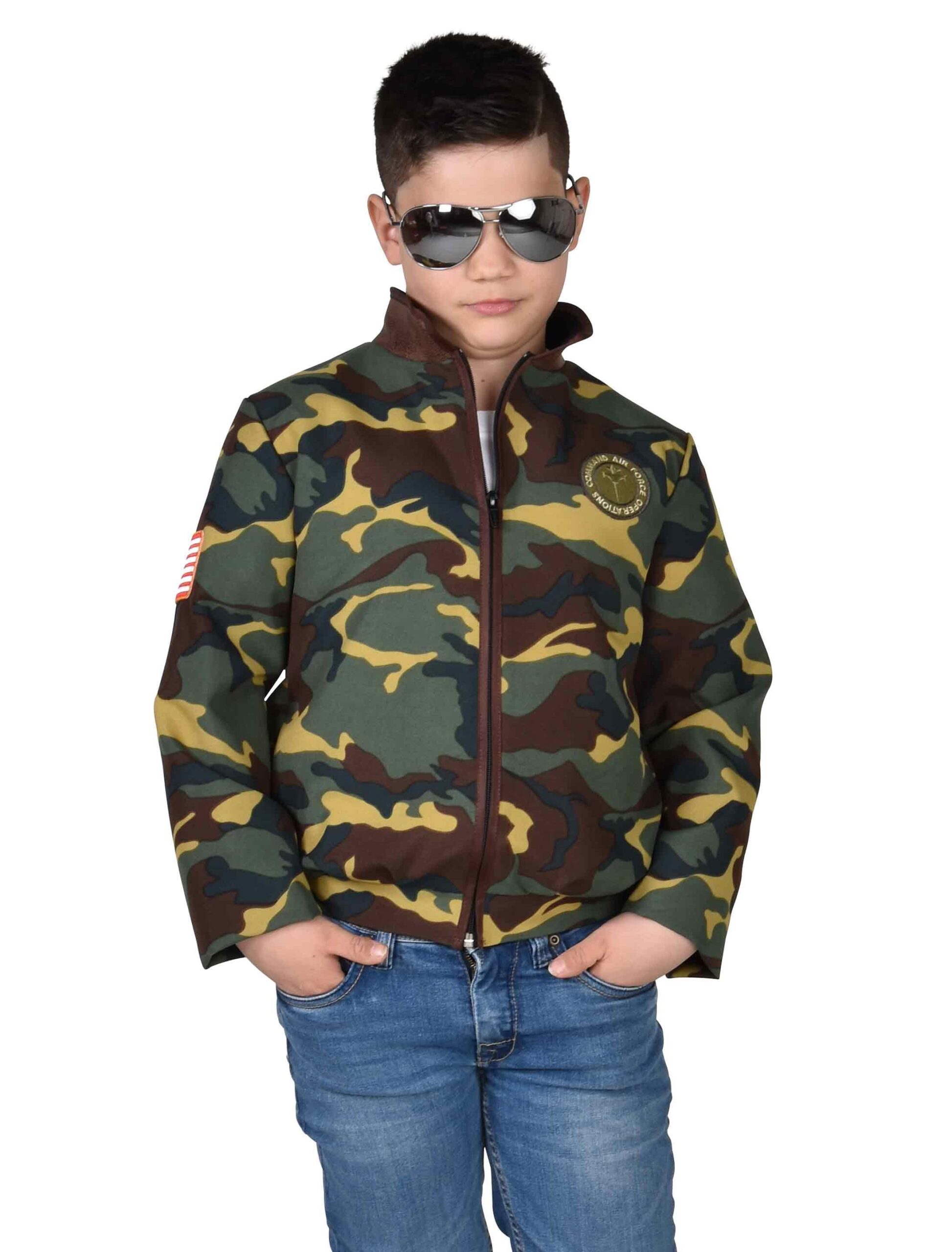 Coole Kids tragen Camouflage! Mit dieser Jacke im coolen Camouflage-Muster bist Du ein wahrer Trendsetter. Die kurze Jacke, die von einem grün-braun-gelben Tarnmuster geziert wird, besticht durch den coolen Stehkragen, dem praktischen Reißverschluss in der Front und den beiden authentischen Aufnähern: Auf der Brust befindet sich ein Air Force Operationsâ€-Aufnäher, auf dem rechten Oberarm eine amerikanische Flagge. Mit einer getönten Brille und schwarzen Stiefeln setzt Du Deine Camouflage Jacke für Kinder gekonnt in Szene! Exklusiv Artikel.