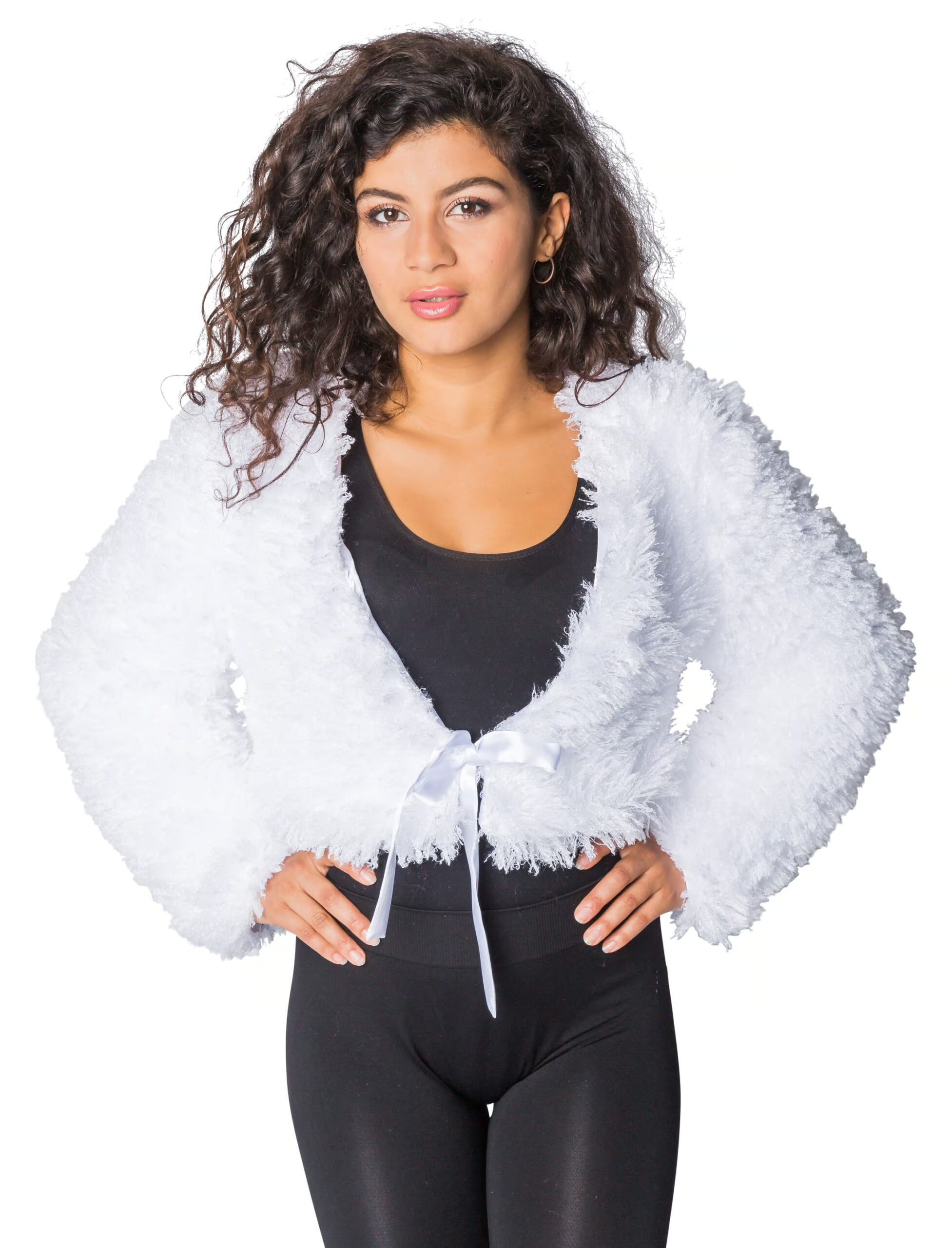 Ein schneeweißer Traum! Mit diesem flauschigen Bolero aus weißem Kunstfell bist Du der plüschige Mittelpunkt jeder Party. Die kurz geschnittene Damen Jacke betont nicht nur Deine Taille, sondern durch den V-Ausschnitt auch Dein Dekolletee. Durch ein Satinband in der Front lässt sich die Jacke bequem schließen.