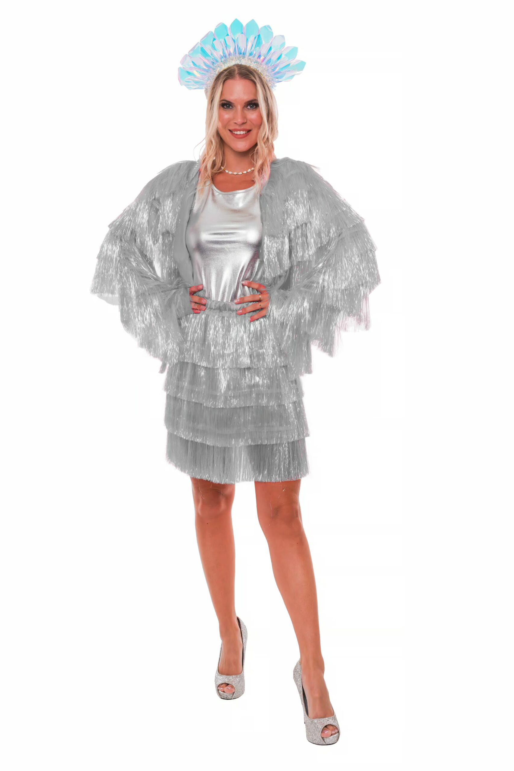 Mit unserer feinen Lametta Jacke für Damen bist du der funkelnde Mittelpunkt jeder Party! Diese außergewöhnliche Jacke ist gemacht für große Auftritte – glänzend, auffällig und voller Bewegung. Die langärmelige Jacke ist von oben bis unten in mehreren Lagen schimmerndem Lametta eingehüllt. Die feinen, glänzenden Streifen tanzen bei jeder Bewegung mit und erzeugen einen lebendigen, glitzernden Effekt, der garantiert für Aufmerksamkeit sorgt. Ob als Highlight fürs Festival, Karneval, die Bühne oder jede andere Gelegenheit, bei der du glänzen willst – mit dieser Jacke bist du bestens ausgestattet!